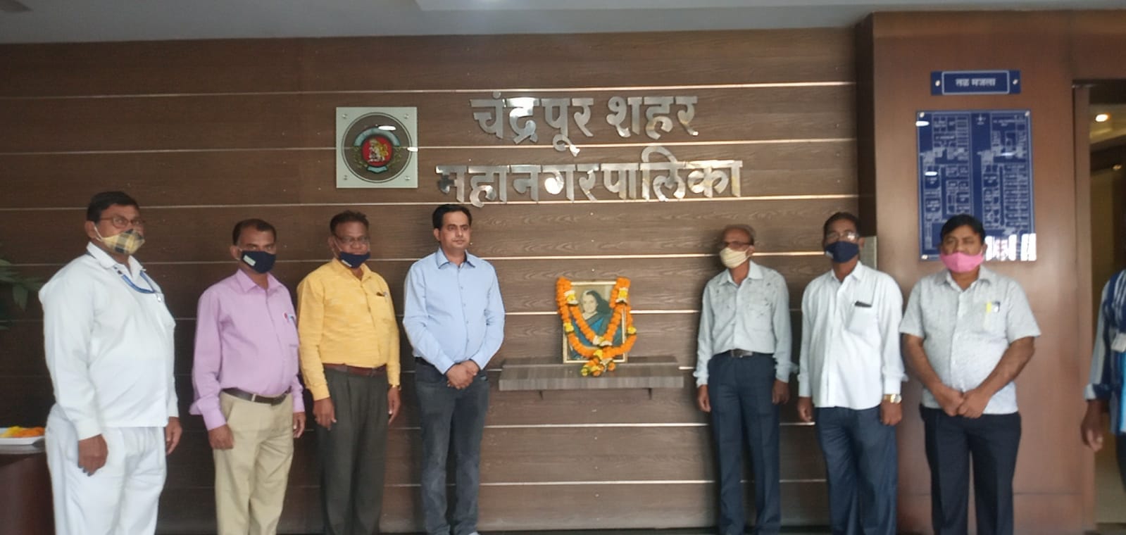 चंद्रपूर, ता. १९ : भारताच्या माजी पंतप्रधान श्रीमती इंदिरा गांधी यांच्या जयंतीनिमित्त अतिरिक्त आयुक्त विपीन पालीवाल यांच्या हस्ते पुष्पहार घालून अभिवादन करण्यात आले.