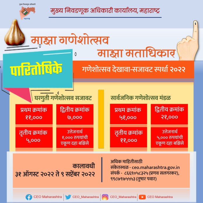 Breaking Newsगडचिरोलीचंद्रपूरभंडारामहाराष्ट्रविदर्भसामाजिकमुख्य निवडणूक अधिकारी, महाराष्ट्र यांनी ‘गणेशोत्सव देखावा-सजावट स्पर्धा २०२२ – माझा गणेशोत्सव, माझा मताधिकार’ या स्पर्धेचे आयोजन केले आहे. By public samachar - August 29, 2022मुख्य निवडणूक अधिकारी, महाराष्ट्र यांनी ‘गणेशोत्सव देखावा-सजावट स्पर्धा २०२२ – माझा गणेशोत्सव, माझा मताधिकार’ या स्पर्धेचे आयोजन केले आहे. स्पर्धेचा विषय : मताधिकार, आधारकार्ड जोडणी, निवडणूक, लोकशाही