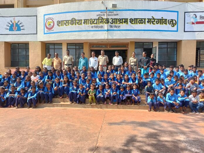 आज बालक दिनानिमित्त पोलीस प्रशासन सिंदेवाही तर्फे सिंदेवाही तालुक्यात येत असलेल्या शासकीय माध्यमिक आदिवासी आश्रम शाळा मरेगाव येथे भेट देऊन बालक दिन साजरा करण्यात आला.