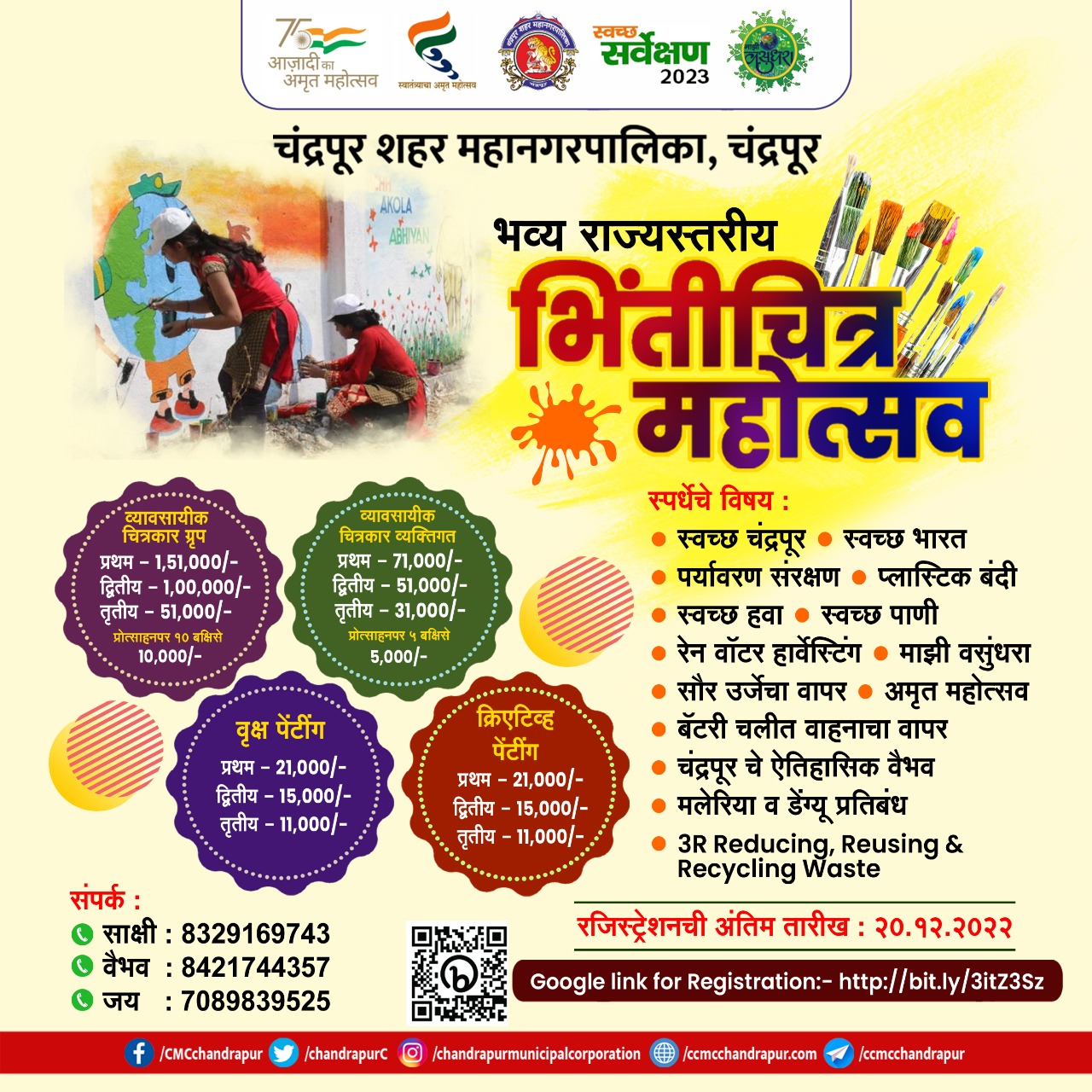 सदर स्पर्धा ही शहर स्वच्छता व सौंदर्यीकरण अभियान, स्वच्छ सर्वेक्षण 2023 आणि माझी वसुंधरा अभियान अंतर्गत घेण्यात येत असुन विचारप्रवर्तक आणि नाविन्यपुर्ण अशी भिंतीचित्रे तयार करु शकणाऱ्या चित्रकार आणि कलाप्रेमींसाठी ही स्पर्धा आहे. शहरातील मुख्य दर्शनी भागातील भिंतींवर स्वातंत्र्य संग्रामातील शिलेदार, पर्यावरण संरक्षण, स्वच्छतापर संदेश, प्लास्टीक बंदी चंद्रपूरचे ऐतिहासिक वैभव, रेन वॉटर हार्वेस्टींग अशा विविध १४ विषयाचे चित्रण केले जाणार आहे.