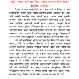 Breaking Newsक्राईम जगतचंद्रपूरमहाराष्ट्रविदर्भसामाजिकहोळी व धुलीवंदन सनादरम्यान दारु पिऊन वाहन चालविणाऱ्यांवर होणार दंडात्मक कार्यवाही By public samachar - March 3, 2023होळी व धुलीवंदन सनादरम्यान दारु पिऊन वाहन चालविणाऱ्यांवर होणार दंडात्मक कार्यवाही