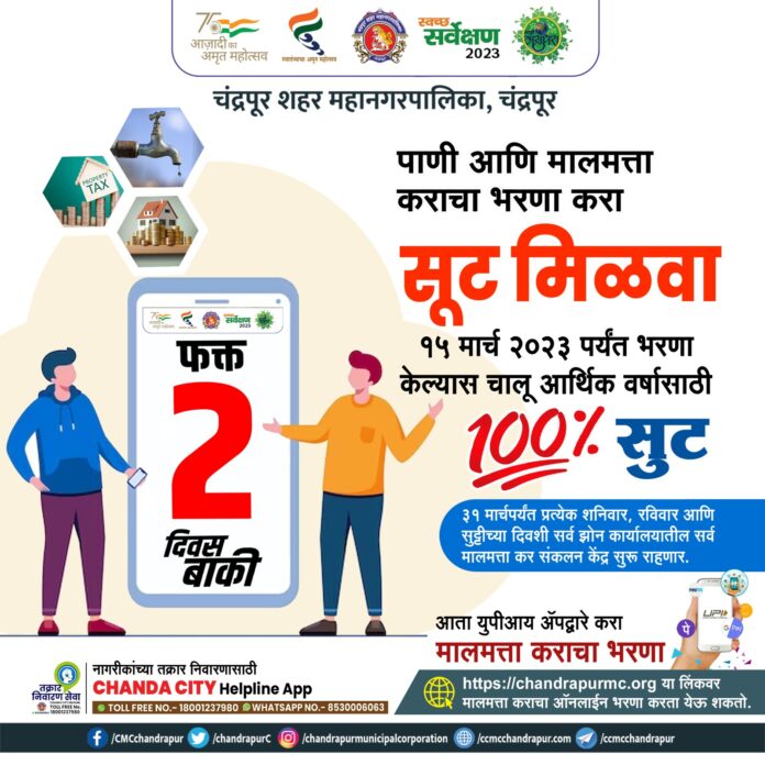 चंद्रपूर शहर महानगरपालिकेच्या माध्यमातून कर वसुलीसाठी विशेष मोहीम राबविण्यात येत आहे. तसेच वारंवार सूचना देऊनही कर न भरणाऱ्या आणि टाळाटाळ करणाऱ्या दुकानदारांचे गाळे सील करण्याची कारवाई सुरू आहे. अनेक मालमत्ताधारकांवर जप्तीची कारवाई करण्यात आली आहे. मोठ्या प्रमाणात कराची थकबाकी असल्याने वसुलीसाठी प्रत्येक झोननिहाय जप्ती पथक गठीत करण्यात आले असुन सदर जप्ती पथके पुर्ण क्षमतेने कार्यरत आहेत. https://chandrapurmc.org या लिंकवर मालमत्ता कराचा ऑनलाईन भरणा करता येऊ शकतो. १०० टक्के सूट मिळविण्यासाठी बुधवार १५ मार्च पर्यंत कार्यालयीन वेळेत कराचा भरणा करण्याचे आवाहन मनपा प्रशासनाने केले आहे.