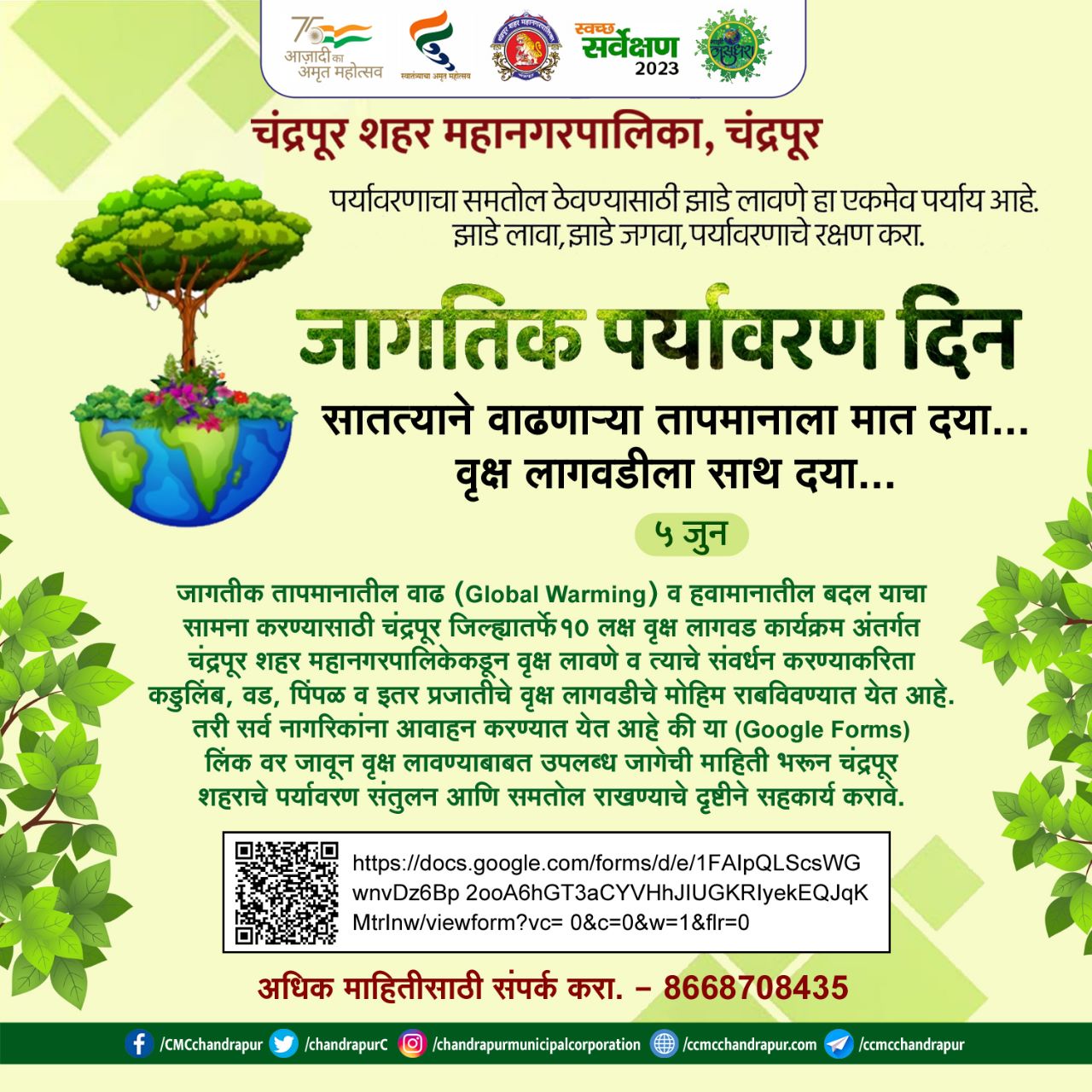 जागतीक तापमानातील वाढ (Global Warming) व हवामानातील बदल चा सामना करणेसाठी चंद्रपूर जिल्ह्यात 10 लक्ष वृक्ष लागवड कार्यक्रम अंतर्गत चंद्रपूर शहर महानगरपालिके कडून वृक्ष लावणे व त्याचे संवर्धन करण्याकरिता कडुलिंब, वड, पिंपळ व इतर प्रजातीचे वृक्ष🌳🌳 लागवडीचे मोहिम राबविवण्यात येत आहे. तरी सर्व नागरिकांना आवाहन करण्यात येत आहे की या👇 (Google Forms) लिंक वर जावून वृक्ष लावण्याबाबत उपलब्ध जागेची माहिती भरून चंद्रपूर शहराचे पर्यावरण संतुलन आणि समतोल राखण्याचे दृष्टीने सहकार्य करावे. अधिक माहितीसाठी संपर्क करा. 8668708435