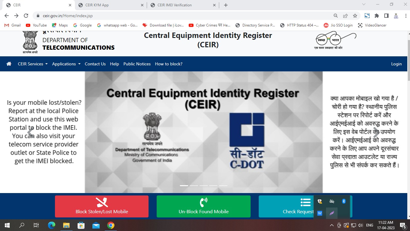 चोरी अथवा हरविलेल्या मोबाईलची तक्रार करण्याकरीता ऑनलाईन पोर्टल राष्ट्रीय गुन्हें अभिलेख केंद्र, नवी दिल्ली (NCRB) यांनी सुरु केला आहे तरी सर्व नागरीकांनी या सुविधेचा जास्तीत जास्त वापर करावा याकरीता सर्वांना प्रेरीत करावे ही विनंती. https://www.ceir.gov.in/Home/index.jsp