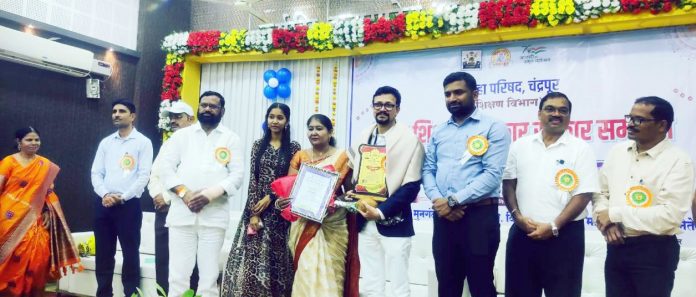 जिल्ह्यातील पुरस्कार प्राप्त शिक्षक : प्राथमिक विभागाचे पांडुरंग मेहेरकुरे(सोनेगाव(बेगडे)ता. चिमूर), माधव हाके (कोकेवाडा(मान) ता. भद्रावती), भास्कर डांगे (बाखर्डी ता.कोरपना), एकता बंडावार (केमारा ता. पोभूंर्णा), हिरालाल बनसोड (जवराबोडी (मेंढा) ता. ब्रह्मपुरी), सुनील हटवार (पारडी ठवरे ता. नागभीड), प्रशांत काटकर (बोर्डा, चंद्रपूर,) नरेश बोरीकर (गिलबिली ता.बल्लारपूर), वसंत राखुंडे (महालगाव ता.वरोरा), विठ्ठल गोंडे (कुडेसावली ता. गोंडपिपरी), बंडू राठोड (आंबेझरी ता. जिवती), प्रशांत बांबोळे (सुशी, ता. मुल), राजेश पवार (मानोली खुर्द, ता. राजुरा), अविनाश घोनमोडे (लोंढोली, ता. सावली), विनोद शास्त्रकार (खातगाव, ता.सिंदेवाही) दिव्यांग संगीत/कला/शिक्षक पुरस्कार संतोष मेश्राम (खराळपेठ ता. गोंडपिपरी), माध्यमिक विभाग शिक्षक शैलेश बरडे(विसापूर ता. बल्लारपूर) मान्यवरांच्या हस्ते जिल्हा शिक्षक पुरस्कार प्राप्त 17 शिक्षकांचा शाल, श्रीफळ, स्मृतीचिन्ह देऊन कुटुंबासह सत्कार करण्यात आला.