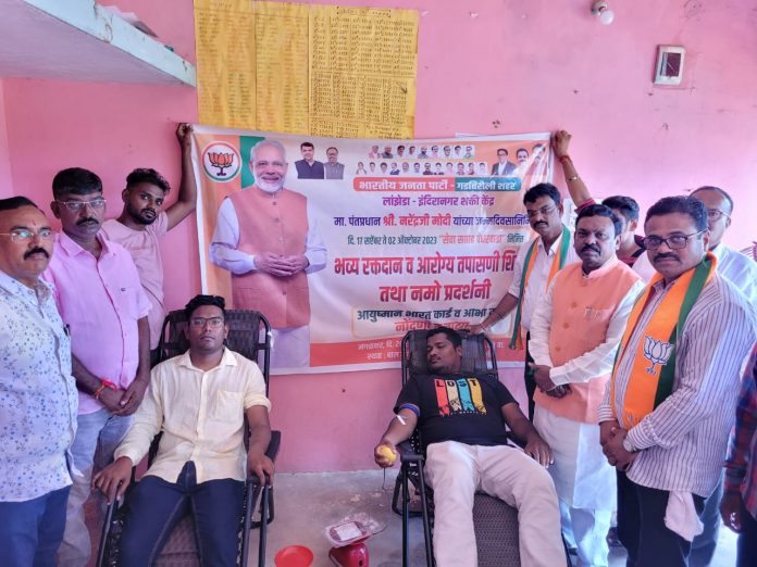 गडचिरोली:- भारतीय जनता पार्टी गडचिरोली शहर शक्तीकेंद्र यांच्या वतीने देशाचे लाडके लोकप्रिय पंतप्रधान मान.नरेंद्र जी मोदी यांच्या वाढदिवसाच्या निमित्ताने सेवा पंधरवाडा या कार्यक्रमा निमित्त भव्य रक्तदान व आरोग्य तपासणी शिबिर तथा नमो प्रदर्शनी,आयुष्यमान भारत कार्ड व आभा कार्ड नोंदणी वाटपाचा कार्यक्रम लांझेडा, इंदिरानगर येथे बाल गणेश मंडळा जवळ आयोजित करण्यात आले होते.