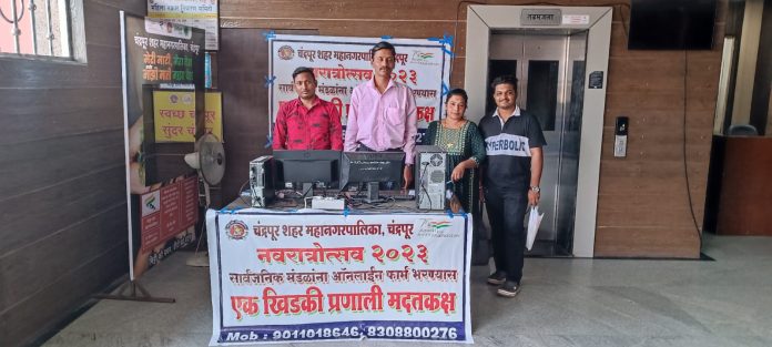 https://pandal.cmcchandrapur. com/ येथे करावा ऑनलाईन अर्ज चंद्रपूर ४ ऑक्टोबर – चंद्रपूर महानगरपालिका हद्दीत नवरात्र उत्सवासाठी एकल खिडकी योजनेची (single window system ) सुरुवात करण्यात आली आहे. सार्वजनिक ठिकाणी मंडप, स्टेज उभारण्यासाठी आता मंडळांना ऑनलाईन अर्ज (Application) सादर करता येणार आहेत. सादर केलेल्या अर्जांची छाननी करून संबंधित विभागाकडुन परवानगी मिळाल्यावर महानगरपालिकेतर्फे अंतिम परवानगी प्रदान करण्यात येणार आहे.