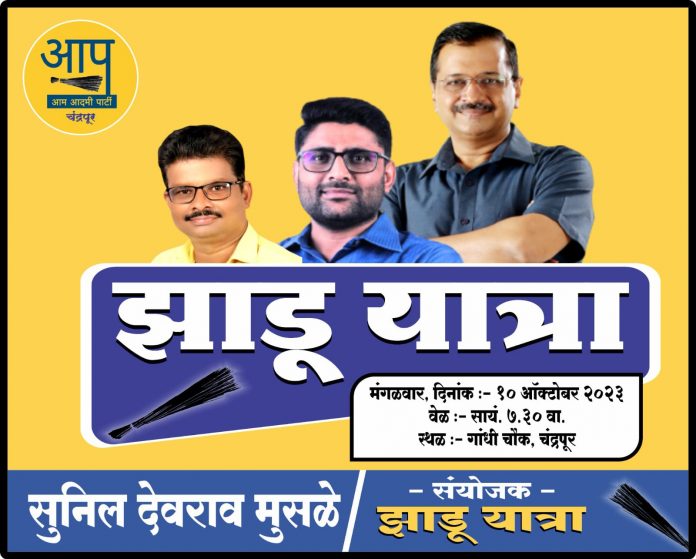 चंद्रपूर, 9 ऑक्टोबर : आम आदमी पक्षाची विदर्भ झाडू यात्रा 10 आणि 11 ऑक्टोबर रोजी चंद्रपूर जिल्ह्यात येत आहे. या यात्रेची जिल्ह्यात सर्वत्र उत्सुकता आहे. झाडू यात्रेनिमित्त चंद्रपूर जिल्ह्यात जय्यत तयारी करण्यात आल्याची माहिती पक्षाचे वरिष्ठ नेते सुनील मुसळे, जिल्हाध्यक्ष मयूर राईकवार यांनी दिली.