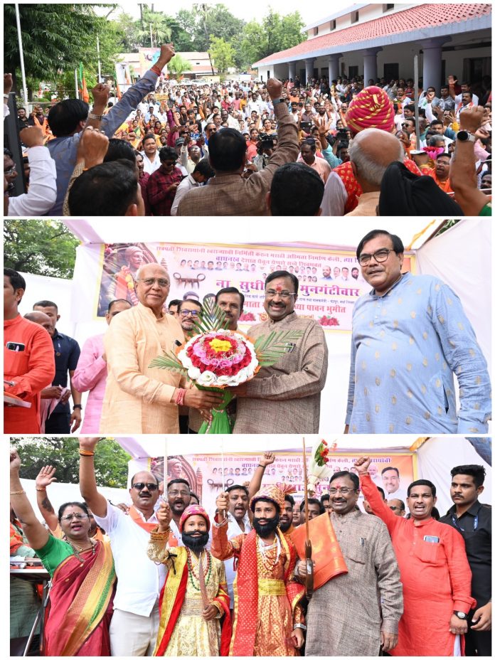 ना. श्री. सुधीर मुनगंटीवार नागपूरच्या डॉ. बाबासाहेब आंबेडकर आंतरराष्ट्रीय विमानतळावर दाखल झाल्यापासून तर चंद्रपूरला येईपर्यंत नागपूर, जाम, वरोरा, भद्रावती, पडोली आदी ठिकाणी नागरिकांनी जल्लोष केला. अनेकांनी ना. श्री. मुनगंटीवार यांचे अभिनंदन केले आणि शुभेच्छाही दिल्या. त्यानंतर चंद्रपुरात भव्य स्वागत सोहळ्याचे आयोजन करण्यात आले. यावेळी हरीश शर्मा भाजपा जिल्हाध्यक्ष चंद्रपूर,राहुल पावडे भाजपा महानगर अध्यक्ष ,चंदन सिंग चंदेल माजी वनविकास महामंडळाचे अध्यक्ष,देवराव भोंगळे माजी भाजपा जिल्हाध्यक्ष,अतुल देशकर माजी आमदार , माजी आमदार संजय धोटे, माजी आमदार सुदर्शन निमकर,विजय राऊत,नामदेव डाहुले,रामपाल सिंग, संध्याताई गुरनुले,अल्काताई आत्राम,रेणुकाताई दुधे,विवेक बोढे,आशिष देवतळे,रमेश राजुरकर, अंजलीताई घोटेकर,सुभाष कासनगोटूवार,ब्रिजभुषण पाझारे आणि अनेक सामाजिक संस्थांनचे पदाधिकारी उपस्थित होते.