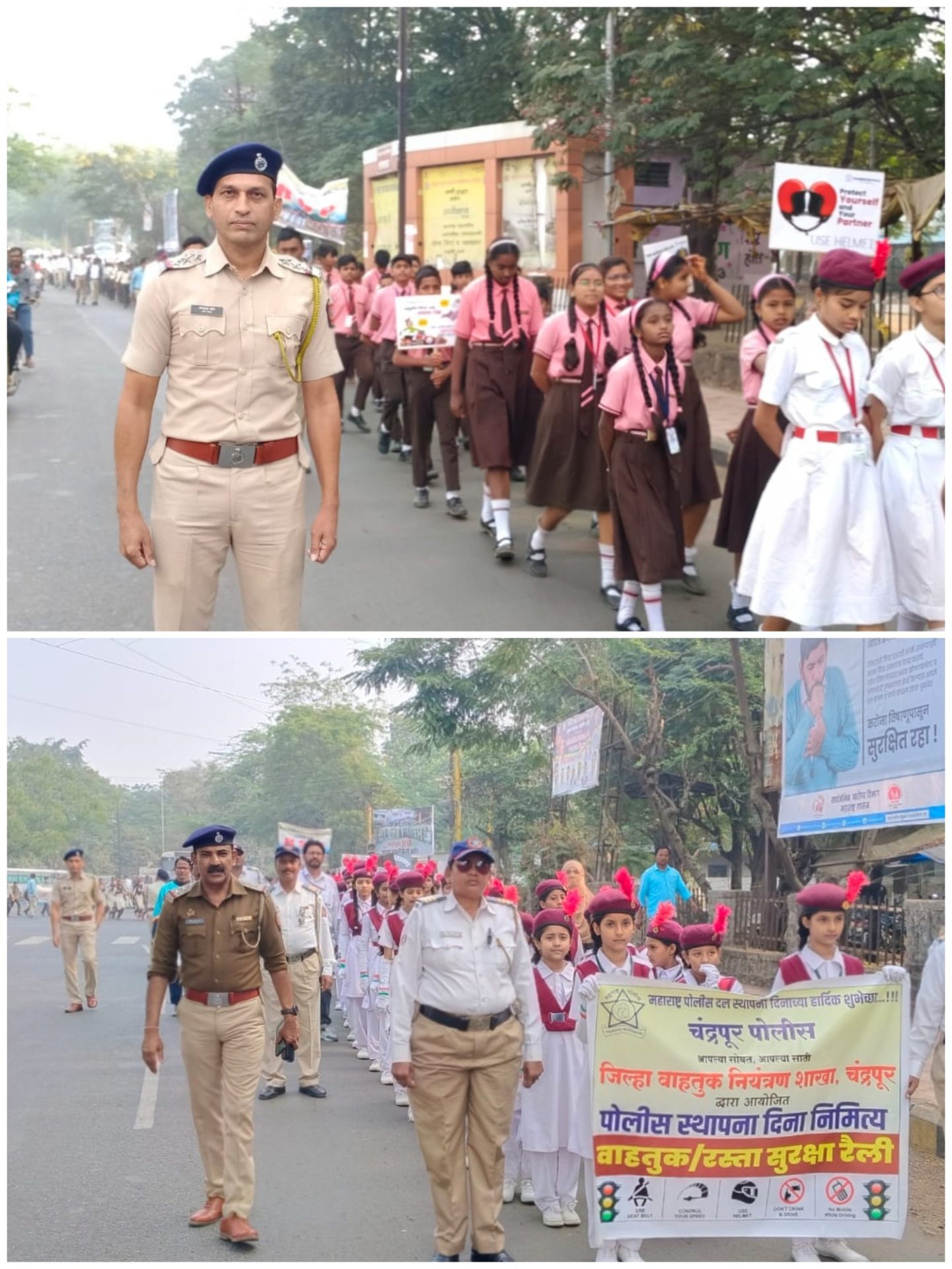 महाराष्ट्र चंद्र पोलीस स्थापना दिना निमीत्यपुर जिल्हयात दि.०२/०१/२०२४ पासुनच उपक्रम राबविण्यात येत आहे. आज दि.०४/०१/२०२४ रोजी वाहतुक नियंत्रण शाखे तर्फे पोलीस स्थापना दिनानिमित्त मा.पोलीस अधिक्षक रविंद्रसिंह परदेशी अपर पोलीस अधिक्षक यांच्या मार्गदर्शनात वाहतुक नियमाविषयी जनजागृत्ती रॅली आयोजीत करण्यात आली होती. सदर रॅलीचे प्रमुख पाहुणे म्हणुन जितेंद्र गादेवार, तहसिलदार चंद्रपुर विभाग हे उपस्थित होते. मा. श्री. जितेंद्र गादेवार सा. यांनी रॅली ला हिरवा झेंडा दाखवुन रॅलीला सुरूवात केली.सदरॅलीमध्ये भवानजी भाई रब्बी भाई हायस्कुल, रफी अहमद किदवाई हायस्कुल, सेंट फ्रान्सिस कॉनहॅट, छोटुभाई पटेल हायस्कुल, बापुराव वानखेडे या सर्व शाळेमधील आर.एस.पी., एन.सी.सी व इतर विद्याथी असे एकुण २००विद्यार्थी हजर होते. वाहतुक निमयांविषयी नागरीकांमध्ये जनजागृत्ती करीता रॅली वाहतुक नियंत्रण शाखा ते प्रियदर्शिनी चौक व प्रियदर्शिनी चौक ते वाहतुक नियंत्रण शाखा पर्यंत रॅली काढण्यात आली.रॅली मध्ये उप प्रादेशीक परीवहन विभागाचे अधिकारी गौरव तेलरांधे, अनुराग सालंनकर, वाहतुक नियंत्रण शाखेचे पोलीस निरिक्षक रोशन यादव, प्रविणकुमार पाटील, पोउपनि सुधिर जाधव तसेच इतर अधिकारी व कर्मचारी आणी शिक्षकवर्ग उपस्थित होते.
