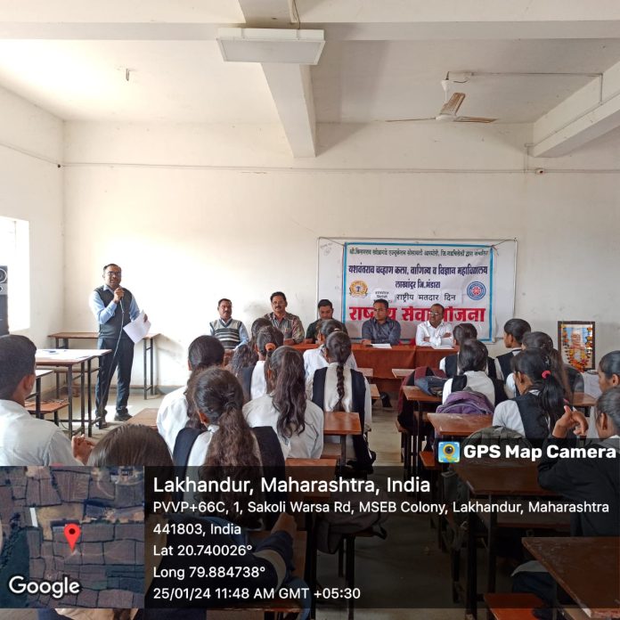 या अनुषंगाने आज दि. २५ जानेवारी २०२४ रोजी ‘राष्ट्रीय मतदार दिन’ साजरा करण्यात आला. सदर कार्यक्रमाचे अध्यक्षस्थानी महाविद्यालयाचे प्राचार्य डॉ. जे. व्ही. दडवे सर, प्रमुख पाहुणे म्हणून श्री. वैभव पवार, मा. तहसीलदार, ता. लाखांदूर, श्री. प्रमोद बेले, मा. नायब तहसीलदार, ता. लाखांदूर, श्री. अखिलभारत मेश्राम, नायब तहसीलदार, ता. लाखांदूर, डॉ. राजू गडपायले, नोडल अधिकारी, व डॉ. विनोद बरडे, रा. से. यो. कार्यक्रम अधिकारी उपस्थित होते.