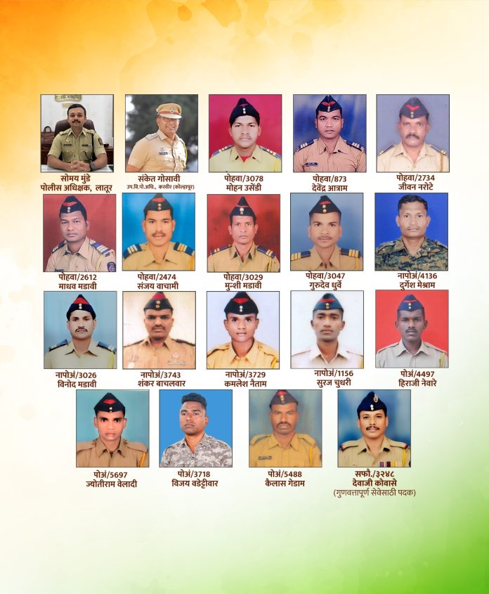पोलीस शौर्य पदक प्राप्त अधिकारी व अंमलदार, १) श्री. सोमय विनायक मुंढे, भा.पो.से. पोलीस अधीक्षक लातुर, २) श्री. संकेत सतीश गोसावी उपविभागीय पोलीस अधिकारी उपविभाग करवीर जि. कोल्हापुर, ३) पोहवा / ३०७८ मोहन लच्छु उसेंडी, ४) पोहवा/८७३ देवेंद्र पुरोषत्तम आत्राम (2nd BAR TO PMG), ५) पोहवा /२७३४ जीवन बुधाजी नरोटे, ६) पोहवा /२६१२ माधव कोरके मडावी, ७) पोहवा/२४७४ संजय वत्ते वाचामी (1″ BAR TO PMG), ८) पोहवा / ३०२९ मुंशी मासा मडावी ९) पोहवा/३०४७ गुरुदेव महारुराम धुर्वे, १०) पोनाअं/३७२९ कमलेश निखेल नैताम, ११) पोनाअं/३७४३ शंकर पोचम बाचलवार, १२) पोनाअं/३०२६ विनोद मोतीराम मडावी, १३) पोनाअं/४१३६ दुर्गेश देविदास मेश्राम, १४) पोअं/३७१८ विजय बाबुराव वडेट्टीवार, १५) पोअं/५४८८ कैलाश श्रवण गेडाम, १६) पोअं/४४९७ हिराजी पिताबर नेवारे, १७) पोअं/५६९७ ज्योतीराम बापु वेलादी, १८) पोअं/११५६ सुरज देवीदास चुधरी यांना पदक मिळाले असुन ०१) सहा. फौ/३२४८ देवाजी कोड्डु कोवासे यांना गुणवत्तापूर्ण सेवेसाठी पदक जाहीर झाले आहे.