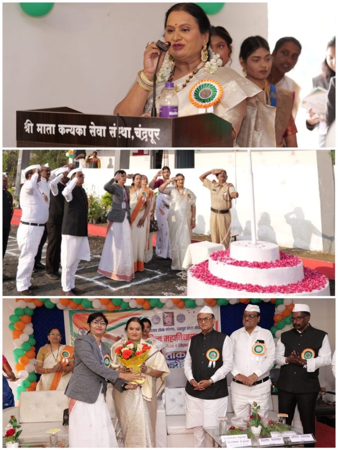 कार्यक्रमाच्या विशेष अतिथी सौ.सपनाताई सुधीर मुनगंटीवार यांच्या हस्ते ध्वजारोहण करण्यात आले. भारत मातेच्या प्रतिमेचे तसेच भारतीय संविधानाचे शिल्पकार भारतरत्न डॉ. बाबासाहेब आंबेडकर यांच्या प्रतिमेचे पूजन करून पुष्पमाला अर्पण करण्यात आली. कार्यक्रमाच्या अध्यक्षस्थानी श्री माता कन्यका सेवा संस्थेचे सचिव श्री राजेश्वर सुरावार होते  तर प्रमुख उपस्थिती महाविद्यालयाच्या प्रभारी प्राचार्या हर्षा खरासे , मा.अनिल दंडमवार, मा.दिलीप नेरलवार मान.जस्सुजी सिंघवी, मा.अजय गोगुलवार, मा.जीवन कोंतमवार, सौ.सोनाली कोल्पॅकवार सौ.अमृता तुंगुडवार, सौ.शिल्पा चिल्लरवार होते. कार्यक्रमाच्या विशेष अथिती सौ.सपनाताई सुधीर मुनगंटीवार यांनी  विद्यार्थीनिमध्ये देशप्रेम राष्ट्राभिमान निर्माण व्हावा यासाठी विद्यार्थीनींना मोलाचे मार्गदर्शन केले. तसेच  कार्यक्रमाचे अध्यक्ष श्री राजेश्वर सुरावार यांनी देशाला स्वातंत्र्य प्राप्त करून देणाऱ्या हुतात्म्यांच्या बलिदानाची आठवण करून दिली. तसेच संस्थेचे अध्यक्ष श्री सुदेश कापर्तीवार सर यांनी उपस्थित सर्व विद्यार्थीनींना , प्राध्यापक वर्ग व शिक्षकेत्तर कर्मचारी यांना प्रजासत्ताक दिनाच्या शुभेच्छा दिल्या.