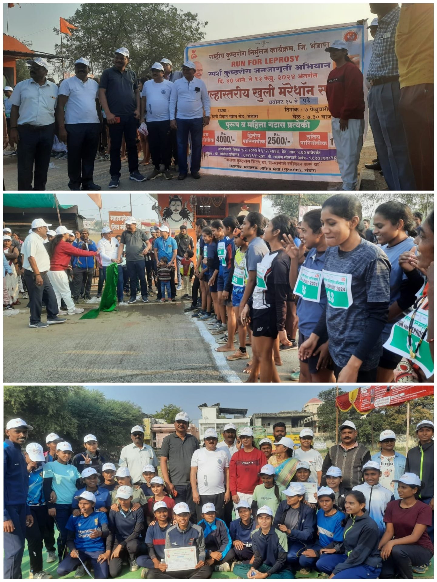 जिल्हास्तरावर स्पर्श कुष्ठरोग जनजागृती करीता 7 फेब्रुवारी रोजी Run For Leprosy अंतर्गत जिल्हास्तरीय खुल्या मॅरेथॉन स्पर्धेचे आयोजन रेल्वे मैदान, खात रोड भंडारा येथुन करण्यात आले. खुल्या मॅरेथॉन स्पर्धेचे उदघाटक म्हणुन डॉ.अभय हातेकर, अधिष्ठाता, वैद्यकिय महाविद्यालय भंडारा, डॉ.मिलींद सोमकुंवर, जिल्हा आरोग्य अधिकारी जि.प.भंडारा, डॉ.दिपचंद सोयाम, जिल्हा शल्य चिकित्सक, जिल्हा रुग्णालय भंडारा यांनी हिरवी झेंडी दाखवून स्पर्धेची सुरवात केली.