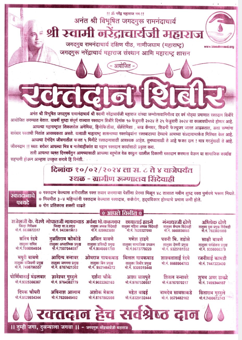 अनंत श्री विभूषित जगदगुरू रामानंदाचार्य श्री स्वामी नरेंद्राचार्यजी महाराज यांच्या जन्मोत्सवानिमीत्य दर वर्ष मोठ्या प्रमाणात रक्तदान शिबीरे आयोजित करण्यात येतात. यावर्षीं सुध्दा संपूर्ण राज्यात रक्तदान शिबीरे दिनांक १० फेब्रुवारी २०२४ ते २५ फेब्रुवारी २०२४ या कालावधीमध्ये होणार आहेत. आपल्या महाराष्ट्रात शिकलसेल अनेमिया, हिमोफितीया, थैलेंसेमिशा, ब्लड कॅनसर, किडनी फेल्युजर जास्त आढळतात, अशा रुग्णांना वारंवार रक्ताची नितांत आवश्यकता असते. यासाठी महाराष्ट्र शासनाच्या रक्तपेढ्यांना रक्तबाटल्या देण्याचे आमच्या संप्रदायामार्फत निश्चित केल आहे. आपल्या दैनंदिन जीवनातील फक्त ५ मिनीटे रक्तदानासाठी आवश्यक आहेत. तुमच्यासाठी ते आहे फक्त दान ! मात्र गरजूंसाठी वे आहे. जीवनदान !! स्वतः बरोबर आपल्या मित्र व नातेवाहीकांत या महान रक्तदान कार्यासाठी प्रवृत्त करा.