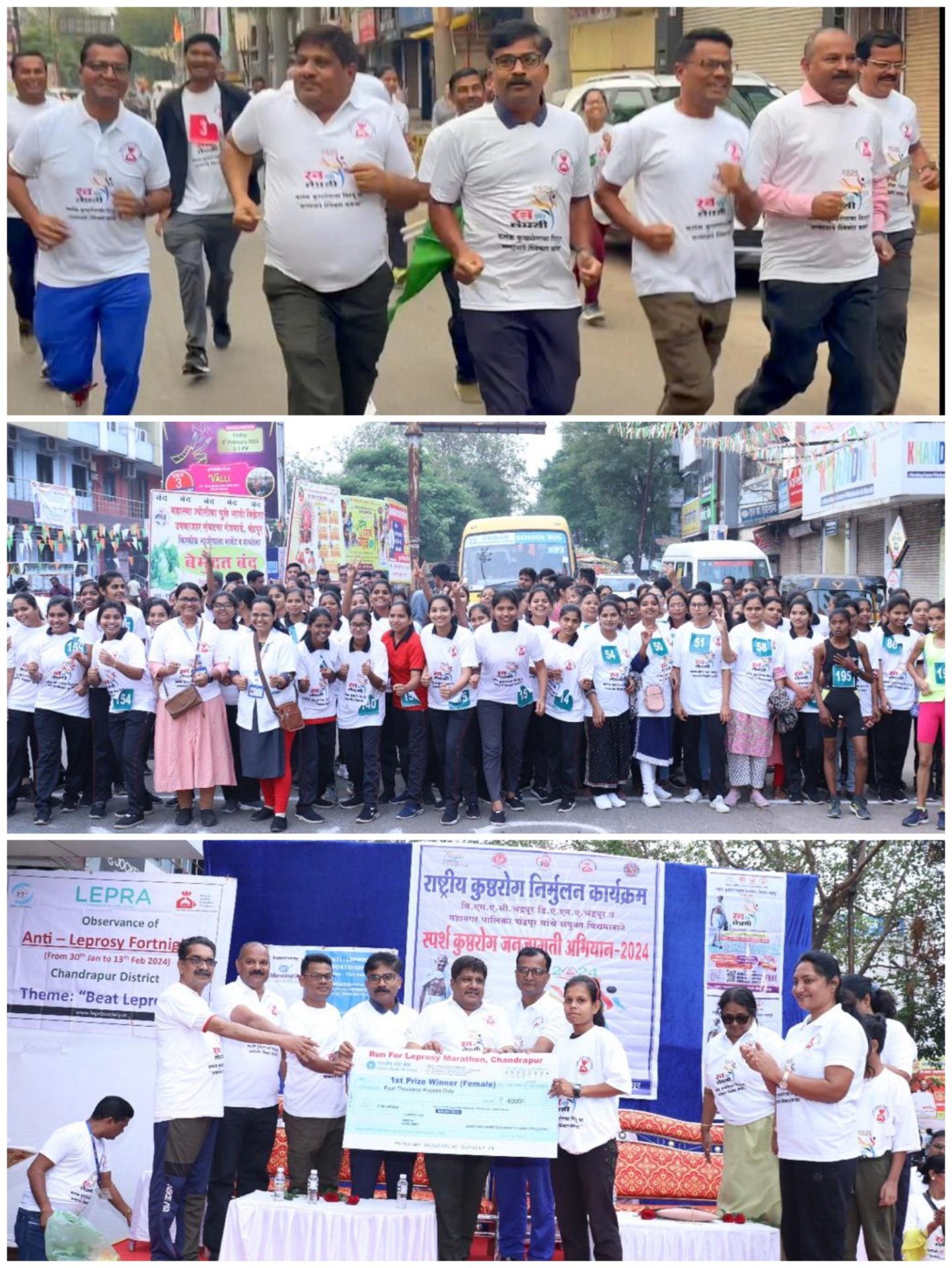 चंद्रपूर, दि. 10: 2027 पर्यंत कुष्ठरोगाचे निर्मूलन करण्याकरीता जिल्ह्यात 30 जानेवारी ते 13 फेब्रुवारी 2024 या कालावधीत कुष्ठरोग जनजागृती मोहीम राबविण्यात येत आहे. त्या अनुषंगाने आज (दि.10 फेब्रुवारी) शहरात “रन फॉर लेप्रसी मॅरेथॉन”चे आयोजन महानगरपालिका येथून करण्यात आले. रन फॉर लेप्रसी मॅरेथॉन मध्ये 333 नागरिकांनी सहभाग घेतला. सदर मॅरेथॉनचा उद्देश लोकांपर्यंत कुष्ठरोगाबाबत असलेले समज, गैरसमज दूर करणे व जनसामान्यांमध्ये कुष्ठरोगाबाबत जनजागृती करणे हा आहे.