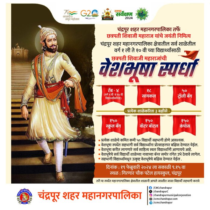 चंद्रपूर १७ फेब्रुवारी – चंद्रपूर महानगरपालिकेतर्फे १९ फेब्रुवारी रोजी शिवजयंती अतिशय उत्साहाने आणि मोठ्या प्रमाणात साजरी करण्याच्या दृष्टीने छत्रपती शिवाजी महाराज व राजमाता जिजाऊ यांच्यावर आधारीत वेशभूषा स्पर्धा आयोजित करण्यात आली आहे. स्पर्धेत शहरातील सर्व शासकीय व खाजगी शाळेतील विद्यार्थी सहभाग घेऊ शकणार असुन आकर्षक वेशभूषा करणाऱ्या विद्यार्थ्यांना बक्षीसे दिली जाणार आहेत.