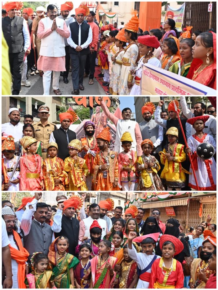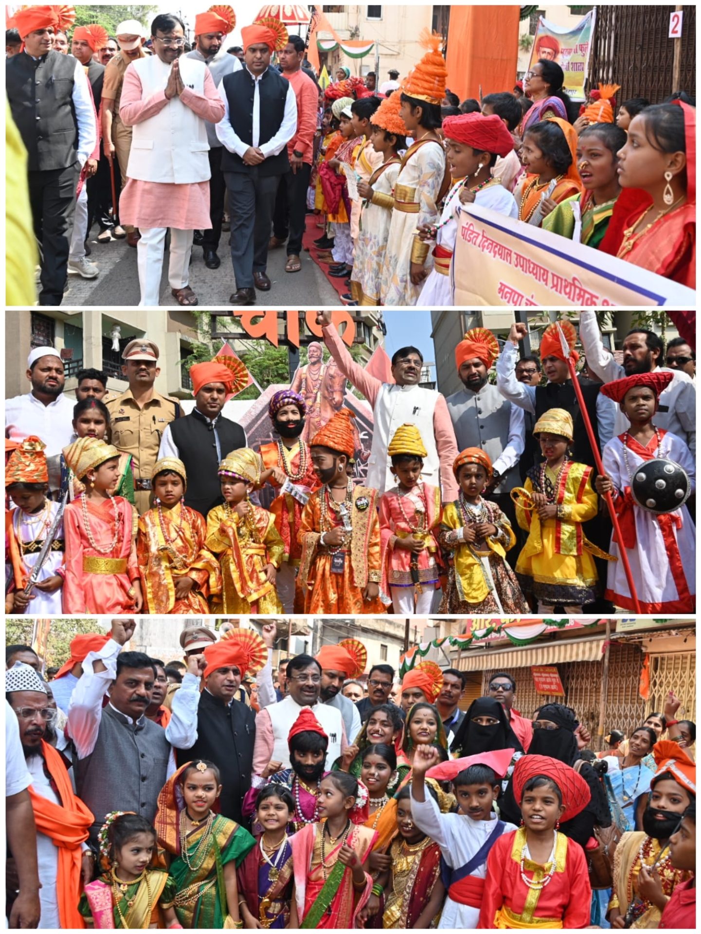 माँ जिजाऊ व छत्रपतींची वेशभुषा ठरली आकर्षण : शिवजयंतीचे औचित्य साधून चंद्रपूर महानगर पालिकेच्या वतीने माँ जिजाऊ व छत्रपतींची वेशभुषा स्पर्धा आयोजित करण्यात आली होती. यात माँ जिजाऊ आणि बाल शिवाजीच्या वेशभुषेत असलेली शालेय मुले गिरनार चौकापासून गांधी चौकापर्यंत रस्त्याच्या बाजुला उभी राहून ‘जय भवानी, जय शिवाजी’ असा जल्लोष करीत होती. त्यांच्या गर्जनेने सर्व परिसर दुमदुमला. यावेळी पालकमंत्री सुधीर मुनगंटीवार यांनी वेशभुषेतील बालकांचे विशेष कौतुक केले. तसेच उत्कृष्ट आयोजनासाठी जिल्हा प्रशासनाचेही अभिनंदन केले.