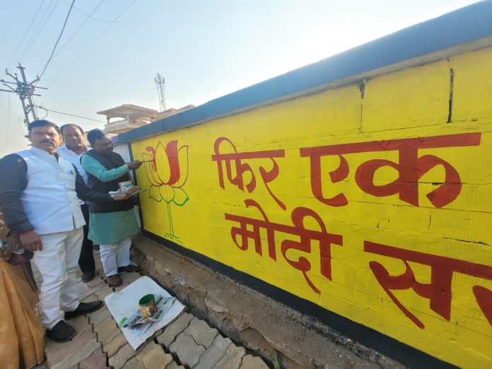 फिर एक बार मोदी सरकार असे दिवार लेखन / आदिवासी विकास मंत्री डॉ. विजयकुमार गावित व खासदार अशोक नेते यांची उपस्थिती
