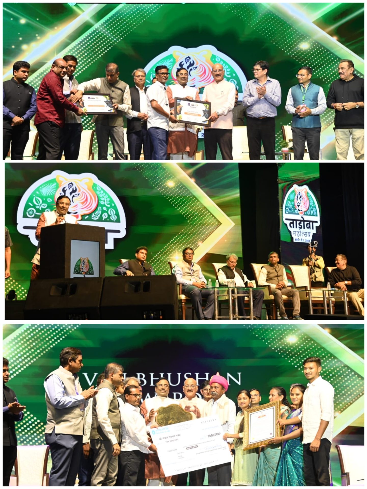 चैतराम पवार यांना पहिला वन भूषण पुरस्कार : आदिवासी कल्याण वनवासी आश्रमाच्या माध्यमातून महाराष्ट्र आणि गुजरात सीमेवरच्या 100 गावांमध्ये वन आणि वन्यजीव संरक्षणासाठी काम करणाऱ्या धुळे जिल्ह्यातील बारीपाडा गावचे चैत्राम पवार यांना पहिला वनभूषण पुरस्कार ताडोबा महोत्सवात वनमंत्री सुधीर मुनगंटीवार यांच्या हस्ते देण्यात आला. यावेळी त्यांना 20 लक्ष रुपयांचा धनादेश व मानपत्र देऊन मान्यवरांच्या हस्ते सन्मानित करण्यात आले.