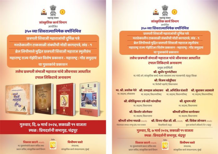 छत्रपती शिवाजी महाराजांच्या राज्याभिषेकाचे ३५०वे वर्ष राज्य सरकारच्या वतीने साजरे केले जात आहे. सांस्कृतिक कार्य मंत्री सुधीर मुनगंटीवार यांच्या संकल्पनेतून गेल्या वर्षभरापासून विविध उपक्रम राबविण्यात येत आहेत. याच उपक्रमांचा एक भाग म्हणून गुरुवारी छत्रपती संभाजी महाराजांच्या जीवनावर आधारित टपाल तिकिटाचे अनावरण केले जाणार आहे. याचवेळी छत्रपती शिवाजी महाराजांच्या दुर्मिळ पत्रांचेही अनावरण होणार आहे. याशिवाय मराठेकालीन टाकसाळी संबंधीची मोडी कागदपत्रे खंड-१, ब्रेल लिपीमध्ये मुद्रित छत्रपती शिवाजी महाराज, ‘महाराष्ट्र – गोंड समुदाय’ हे महाराष्ट्र राज्य गॅझेटिअर यांचेही प्रकाशन या सोहळ्यामध्ये होणार आहे. मंत्री सुधीर मुनगंटीवार यांच्या पुढाकाराने आतापर्यंत छत्रपती शिवाजी महाराज, शहाजीराजे भोसले, माँ जिजाऊ यांच्यावर आधारित टपाल तिकिटाचे प्रकाशन झालेले आहे. याशिवाय श्री. मुनगंटीवार यांनी अधिवेशनात औरंगाबादचे नाव छत्रपती संभाजीनगर होण्यासाठी तत्कालीन सरकारसमोर मागणी लावून त्यासंदर्भात सातत्याने पाठपुरावा केला होता. आता छत्रपती संभाजी महाराजांच्या जीवनावर आधारित टपाल तिकिटाच्या माध्यमातून एक महत्त्वाकांक्षी कार्य पूर्णत्वास येणार असल्याची भावना श्री. मुनगंटीवार यांनी व्यक्त केली आहे.