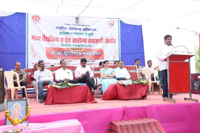 चंद्रपूर दि. 13 मार्च : ग्रामीण भागातील आदिवासी व बिगर आदिवासी जनतेला तालुका स्तरावर तज्ज्ञ वैद्यकीय अधिकाऱ्यांच्या सेवा उपलब्ध व्हाव्यात, या हेतूने सार्वजनिक आरोग्य विभाग चंद्रपूर आणि राष्ट्रीय ग्रामीण आरोग्य अभियान अंतर्गत पोंभुर्णा येथील ग्रामीण रुग्णालयात वैद्यकीय व दंत आरोग्य  शिबिराचे आयोजन करण्यात आले. शिबिराचे उद्घाटन पालकमंत्री सुधीर मुनगंटीवार यांच्या हस्ते दूरचित्रवाणी द्वारे करण्यात आले. यावेळी तालुक्यातील 751 रुग्णांची आरोग्य तपासणी करण्यात आली.