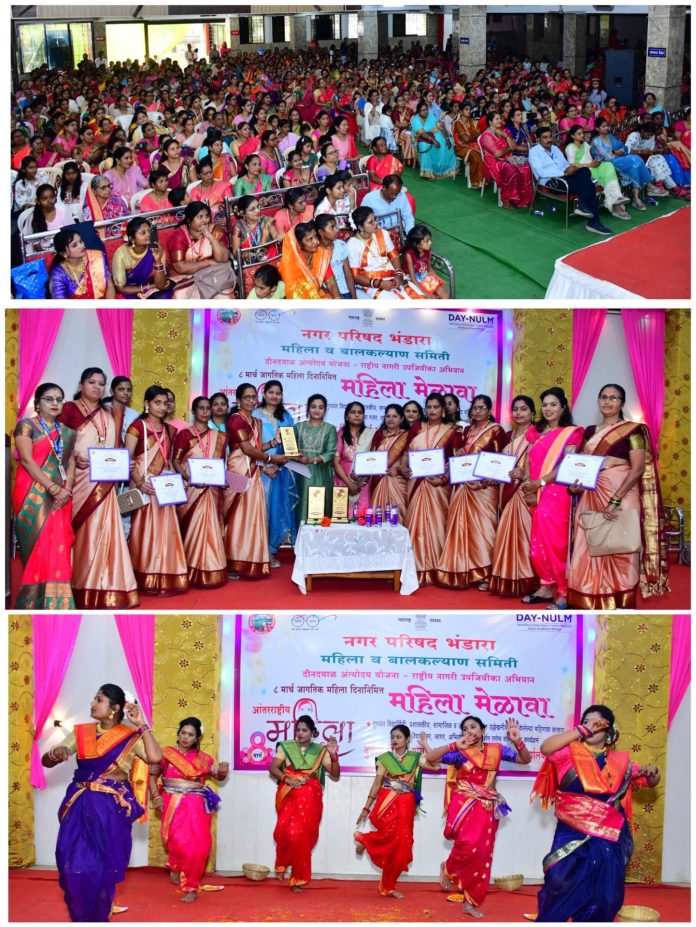 त्यादरम्यान आरोग्य शिबिरात उपस्थित महिलांची शुगर, बीपी व थायराईड तपासणी करण्यात आली होती. तसेच महिला बचत गटाच्या महिला पदाधिकारी-कर्मचारी, स्त्रीशक्तीचा गजर, जागर, अभिव्यक्ती व मार्गदर्शन तसेच महिला बचत गटाच्या पदाधिकारी व सदस्यांनी वेशभुषा, रांगोळी स्पर्धा तसेच सांस्कृतिक कार्यक्रमात व्यक्तिगत, समुह नृत्यांच्या माध्यमातून रसिकांचे मने जिंकली. भारतातील थोर समाजसुधारक महिलांचे पात्र हुबेहूब महिला बचत गटांच्या सदस्यांनी सादर केले.