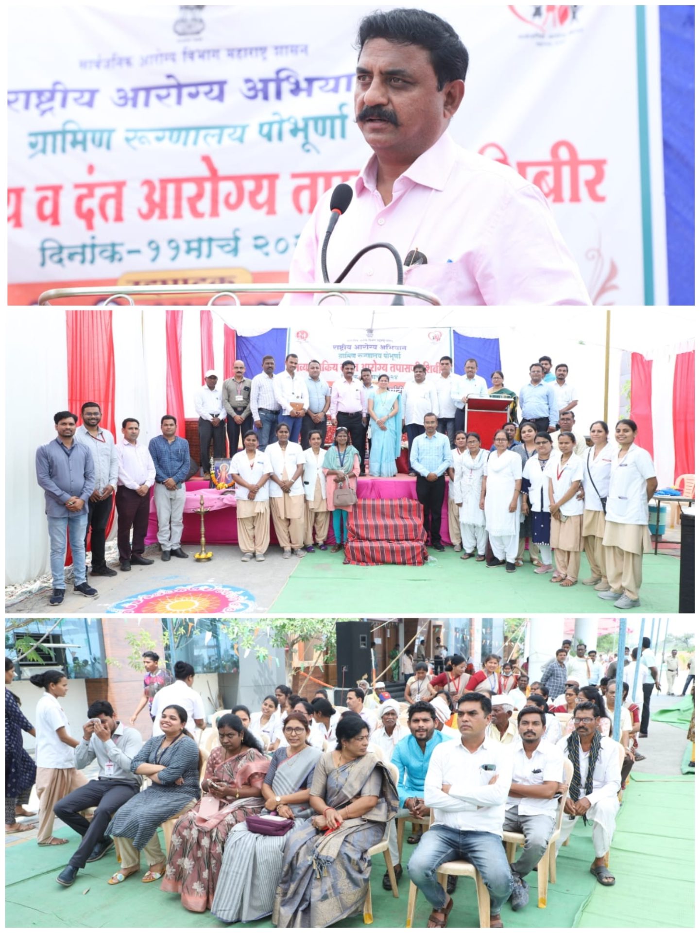 भव्य वैद्यकीय व दंत आरोग शिबिर पोंभूर्णा ग्रामीण भागातील आदिवासी व बिगर आदिवासी जनतेला तालुकास्तरावर तज्ञ वैद्यकीय अधिकाऱ्यांच्या सेवा उपलब्ध व्हाव्यात या हेतूने दिनांक ११ मार्च २०२४ ला सार्वजनिक आरोग्य विभाग चंद्रपूर, राष्ट्रीय ग्रामीण आरोग्य अभियान अंतर्गत ग्रामीण रुग्णालय पोभुर्णा येथे भव्य वैद्यकीय व दंत आरोग्य शिबिराचे आयोजन करण्यात आले. सदर शिबिराचे उद्घाटक मा.नामदार श्री सुधीर भाऊ मुनगंटीवार, वने, सांस्कृतिक कार्य व मस्य व्यवसाय मंत्री महाराष्ट्र राज्य तथा पालकमंत्री चंद्रपूर यांच्या हस्ते दूरचित्रवाणी द्वारे उद्घाटन करण्यात आले. सदर कार्यक्रमाचे अध्यक्षस्थान मा.श्रीमती सुलभाताई पिपरे नगराध्यक्ष नगरपंचायत पोंभूर्णा यांनी भूषवले. विशेष अतिथी म्हणून वैद्यकीय महाविद्यालयाचे अधिष्ठाता डॉक्टर मिलिंद कांबळे ,जिल्हा आरोग्य अधिकारी डॉ अशोक कटारे, डॉ. मंगेश गुलवाडे महासचिव चंद्रपूर जिल्हा ग्रामीण (भाजप), मा. श्री विनोद देशमुख माजी नगराध्यक्ष पोंभूर्णा मा. श्रीमती अलकाताई आत्राम माजी सभापती पंचायत समिती पोंभूर्णा ,मा. श्री अजय मस्के सदस्य रुग्ण कल्याण समिती, ग्रामीण रुग्णालय पोभुर्णा ,मा. श्री सागर जी खडसे मा. मंत्री यांचे वैद्यकीय प्रतिनिधी (भाजप), मा. श्री सचिन धोंडरे मा. मंत्री यांचे विशेष कार्य अधिकारी (भाजप),डॉ. भास्कर सोनारकर अतिरिक्त जिल्हा शल्य चिकित्सक सा. रु. चंद्रपूर ,मा. श्री शिवाजी कदम तहसीलदार पोंभूर्णा, मा श्री संजय सिंह पोलीस निरीक्षक पोलीस ठाणे पोंभूर्णा, मा. श्री विकास चिडगलवार मुख्याधिकारी नगरपंचायत पोंभूर्णा , मा. श्री अरुणराव चनफने संवर्ग विकास अधिकारी पं.स. समिती पोंभूर्णा मा. श्री अमित लाडे बालविकास अधिकारी पंचायत समिती पोंभूर्णा इत्यादी मान्यवर उपस्थित होते. सदर आरोग्य शिबिरामध्ये एकूण ७५१ रुग्णांची तपासणी करण्यात आली. यापैकी २ मुख कर्करोग,१० हायड्रोसील ,१ हर्निया, २९ मोतीबिंदूची रुग्ण मिळाले.सदर रूग्णावर शस्त्रक्रिया करण्यात येणार आहे. सदर कार्यक्रमाचे प्रास्ताविक डॉ. महादेव चिंचोळे जिल्हा शल्यचिकित्सक सामान्य रुग्णालय चंद्रपूर यांनी केले, सूत्रसंचालन श्रीमती भाग्यश्री भालेराव यांनी तर आभार प्रदर्शन डॉ हेमचंद कन्नाके निवासी वैद्यकीय अधिकारी सामान्य रुग्णालय चंद्रपूर यांनी केले. सदर आरोग्य शिबिराचे यशस्वी करिता शरद पवार दंत महाविद्यालय सावंगी मेघे वर्धा , जिल्हा सामान्य रुग्णालयातील वैद्यकीय अधिकारी यांनी विशेष सहकार्य केले. ग्रामीण रुग्णालय पोभुर्णा येथील अधिकारी कर्मचारी यांनी अथक परिश्रम घेतले.
