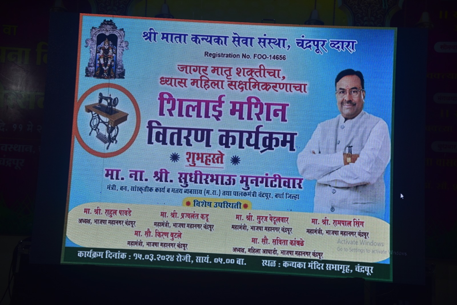 दिनांक १५ मार्च २०२४ रोजी श्री माता कन्यका देवस्थान चंद्रपूरच्या सभागृहामध्ये समाजातील होतकरू, गरीब शंभर महिलांना शिवणयंत्र वितरीत करण्यात आले. यावेळी आभासी पध्दतीने जुडून राज्याचे वने, सांस्कृतीक कार्य व मत्स्यव्यवसाय मंत्री तथा पालकमंत्री चंद्रपूर व वर्धा जिल्हा यांनी महिलांना आणि संस्थेला शुभेच्छा देत समाजभान जपत संस्था कार्य करीत असल्याबद्दल अभिनंदन केले तर संस्थेचे सचिव राजेश्वर सुरावार म्हणाले, महिलांच्या आर्थीक सक्षमीकरणाकरिता आज शिवणयंत्र होतकरू गरीब महिलांना वितरीत करताना समाधान होत आहे. यापुढेही संस्था असे सामाजिक उपक्रम राबविण्यात राहील. यावेळी मंचावर प्रामुख्याने भाजपा महानगर अध्यक्ष राहूल पावडे, अध्यक्षा भाजपा महिला आघाडी चंद्रपूर सौ. सविता कांबळे, महामंत्री प्रज्वलंत कडू, सुरज पेदुलवार, रामपाल सिंह, दिलीप नेरलवार, किरण बुटले, कल्पना बगुलकर, शिला चव्हाण, सुषमा नागोसे, शितल गुरनुले, पुष्पा शेंडे, चंद्रकला सोयाम, वर्षा सोमलकर, मोनिका महातव, संगीता खांडेकर, वंदना तिखे, जयश्री जुमडे, सुवर्णा लोखंडे, वंदना संतोषवार, कल्पना गिरडकर, उषा मेश्राम, भारती दुधानी, रेखा चन्ने आदींची उपस्थिती असून कार्यक्रमाच्या यशस्वीतेकरिता त्यांनी अथक प्रयत्न केले. यावेळी लाभार्थी महिलांनी श्री माता कन्यका सेवा संस्थेचे आभार मानले.