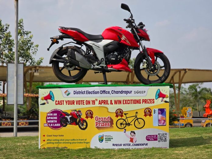 चंद्रपूर, दि. 15 : देशाच्या प्रगतीसाठी, ध्येयधोरणे ठरविण्यासाठी मतदान करून आपला सहभाग लोकशाही प्रक्रियेमध्ये नोंदविणे अत्यंत महत्वाचे आहे. 13 – चंद्रपूर लोकसभा मतदार संघाची निवडणूक 19 एप्रिल 2024 रोजी 2118 मतदान केंद्रावर होणार असून सकाळी 7 ते सायंकाळी 6 वाजेपर्यंत मतदानाची वेळ आहे. या निवडणुकीत जास्तीत जास्त मतदारांनी मतदान करून लोकशाही प्रक्रियेमध्ये सहभागी व्हावे, या उद्देशाने जिल्हा प्रशासनाच्या वतीने ‘तुमचे मत द्या आणि लकी ड्रॉ मध्ये आकर्षक बक्षिसे जिंका’ ही स्पर्धा आयोजित करण्यात आली आहे. तर मतदारांनो, ही स्पर्धा तुमच्यासाठी आहे. बस्स…. 19 एप्रिल रोजी मतदान करून सेल्फी अपलोड करा आणि जिंका बाईक, रेसींग सायकल आणि ॲन्ड्राईड फोन.