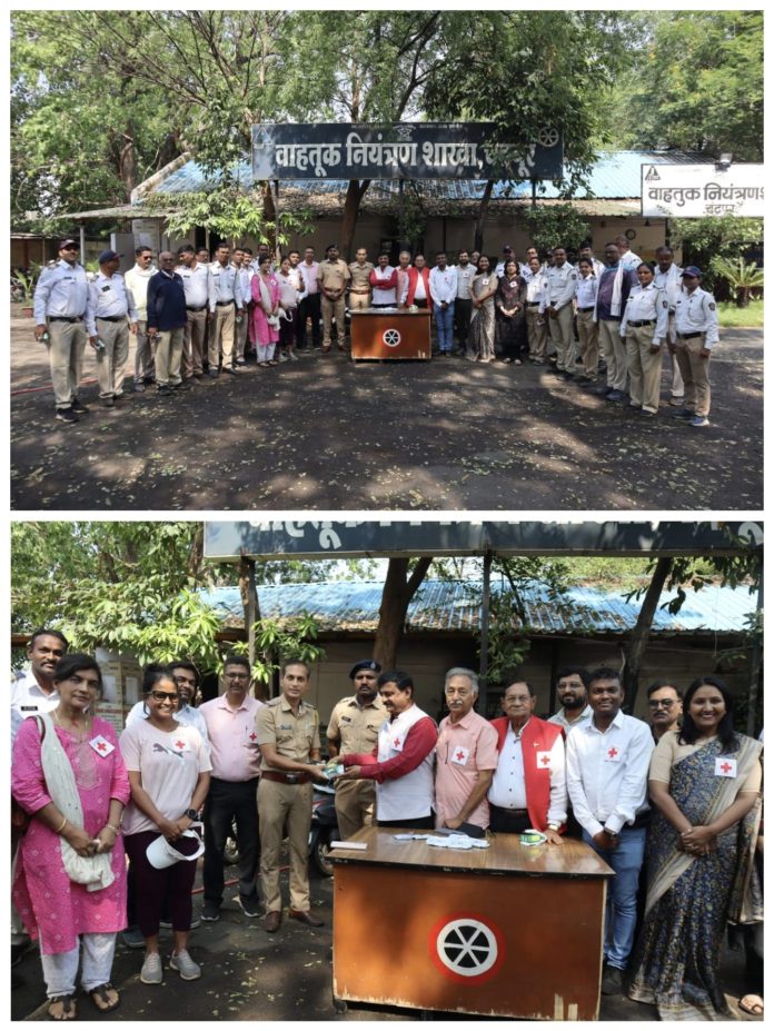 इंडियन रेड क्रॉस सोसायटी, आय. एम.ए.व ट्राफिक पोलीस विभाग चंद्रपूर यांच्या संयुक्त विद्यमानाने 8 मे 2024 रोजी जागतिक रेड क्रॉस दिन साजरा करण्यात आला,या कार्यक्रमाचे प्रमुख पाहुणे म्हणून डॉक्टर मंगेश गुलवाडे यांची प्रमुख उपस्थिती होती. स्थानिक ट्राफिक कार्यालयातील आवारात ट्रॅफिक पोलिसांसाठी उष्माघाता बद्दल च्या विषयावर जनजागृतीपर कार्यक्रमाच्या अनुषंगाने प्रमुख पाहुणे म्हणून बोलताना डॉक्टर मंगेश गुलवाडे यांनी म्हटले की, आपले कर्तव्य बजावत असताना आपल्या आरोग्याची यथायोग्य काळजी घ्यावी.