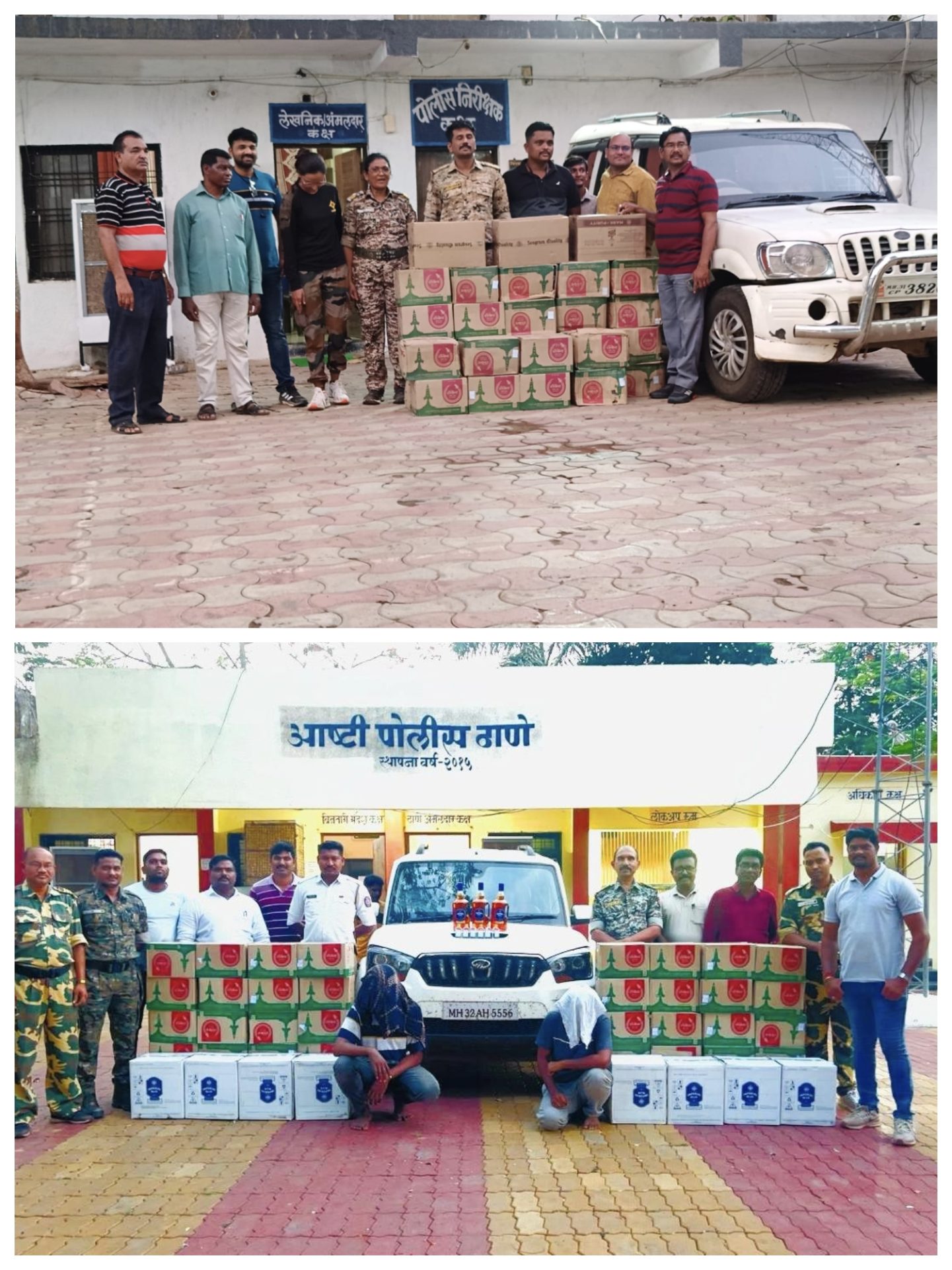 वर्षे, धंदा-मजूरी रा. गवराळा, गणपती वार्ड, भद्रावती जि. चंद्रपूर असे सांगितले. त्यानंतर पोलीस स्टाफने सदर वाहन चेक केले असता, त्यामध्ये १) ०८ बॉक्समध्ये प्रत्येकी ०२ लिटर मापाच्या इंम्पेरीअल ब्ल्यु कंपनिच्या ०६ बाटल्या असे एकुण ४८ बाटल्या, प्रती बाटल किंमत २०००/- प्रमाणे एकुण ९६,०००/- चा मुद्देमाल, २) खाकी रंगाच्या खर्चाचे ४० बॉक्स प्रत्येकी बॉक्समध्ये ९० एमएल मापाच्या रॉकेट देशी दारु संत्रा कंपनीच्या १०० निपा एकुण ४००० निपा, प्रति निप किंमत ८०/- प्रमाणे एकुण ३,२०,०००/- चा मुद्देमाल, दोन नग वापरते जुने विवो कंपनीचे मोबाईल प्रति किंमत ५०००/- प्रमाणे एकुण १०,०००/- चा मुद्देमाल तसेच एक जुनी स्कॉर्पिओ वाहन क्र. एम एच ३२ ए एच५५५६, किंमत अंदाजे १५,००,०००/- असा एकुण १९,२६,०००/- रु. चा मुद्देमाल जप्त करण्यात आला. सदर गुन्ह्यातील दोन्ही आरोपी नामे १) नितेश वशिष्ट चंदनखेडे, २) निखिल राजु क्षिरसागर यांचेविरुद्ध कलम ३०७, ३४ भादंवी, सहकलम ६५ (अ), ८३ म.दा.का., सहकल १८४ मो.वा.का. अन्वये पोस्टे आष्टी येथे गुन्हा नोंद करण्यात आला असून गुन्ह्यातील पुढील तपास पोउपनि. अतुल तराळे करीत आहेत. अशा दोन्ही विभिन्न गुन्ह्यामध्ये चामोर्शी व आष्टी पोलीसांनी देशी व विदेशी दारुसह एकुण २६,७५,०००/- रु. चा मुद्देमाल जप्त केलेला आहे.