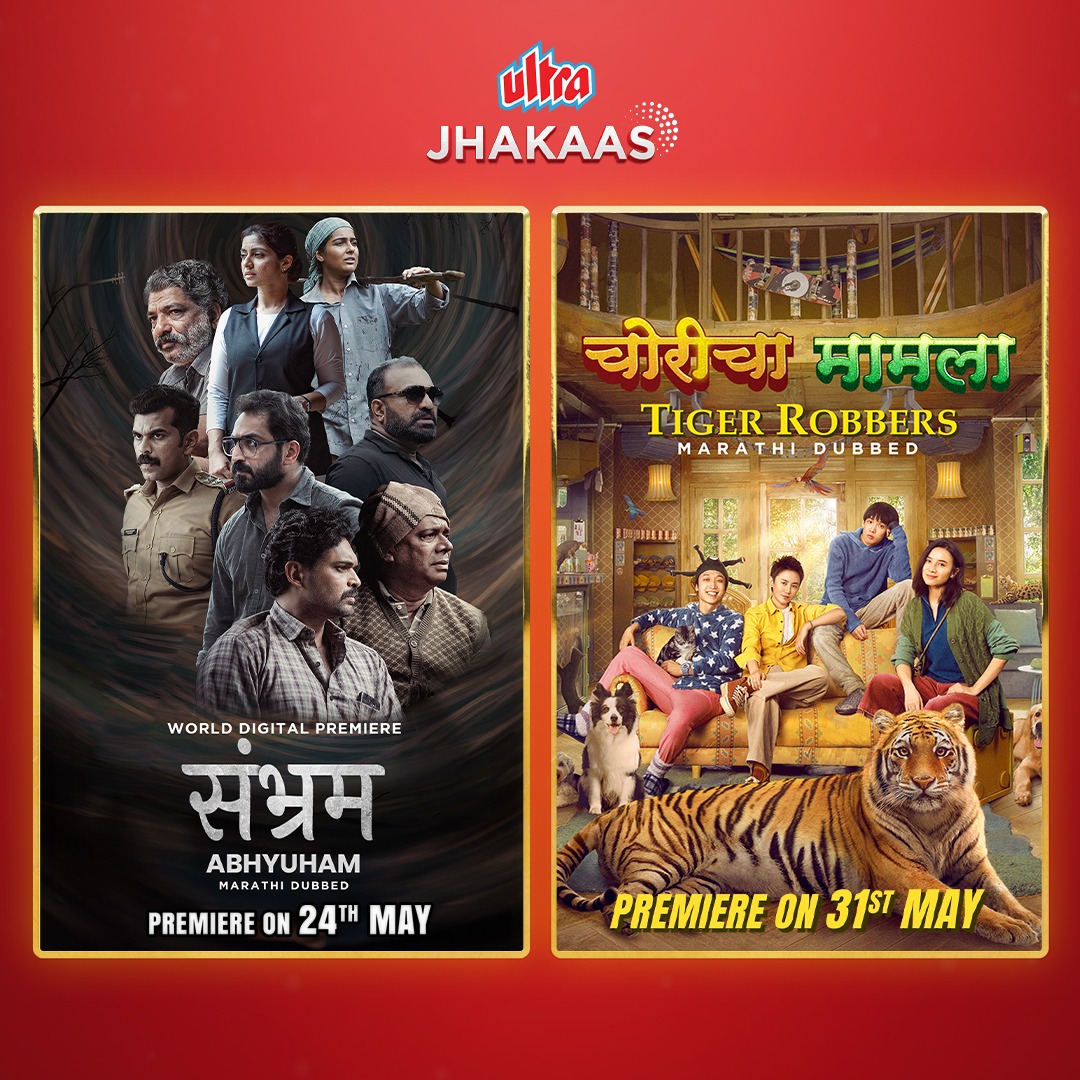 आपल्या रसिक प्रेक्षकांसाठी अल्ट्रा झकास मे महिन्यात दोन जबरदस्त चित्रपट घेऊन येत आहे. क्राईम आणि रहस्याने भरलेला साऊथचा डब चित्रपट ‘अभ्युहम’ म्हणजेच ‘संभ्रम’ २४ मे २०२४ आणि हसून हसून पोट दुखेल असा हॉलीवुड डब कॉमेडी चित्रपट ‘टायगर रोबर्स’ म्हणजेच ‘चोरीचा मामला’ ३१ मे २०२४ रोजी अल्ट्रा झकास मराठी ओटीटीवर प्रदर्शित होणार आहे.