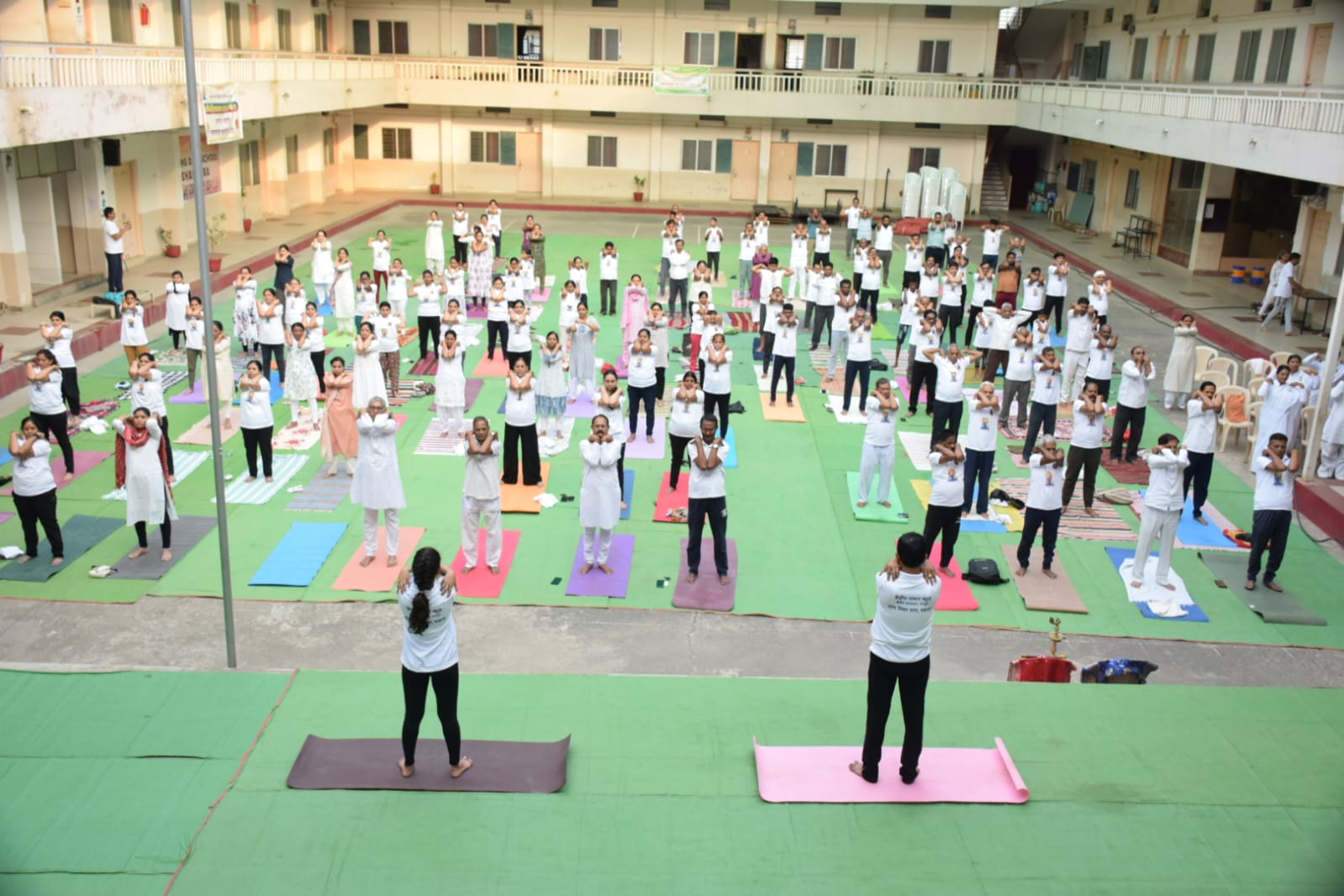 संस्कार भारतीच्या सुंदर रांगोळ्यांनी सजवलेल्या ओंकार आणि भारत मातेच्या फोटो समोर सर्वप्रथम पाहुण्यांच्या हस्ते दीप प्रज्वलन करून ऑकार व भारत माता पूजन करण्यात आले तसेच योग दिनासाठी नियोजित प्रार्थना अर्थासहित म्हटल्या गेली.