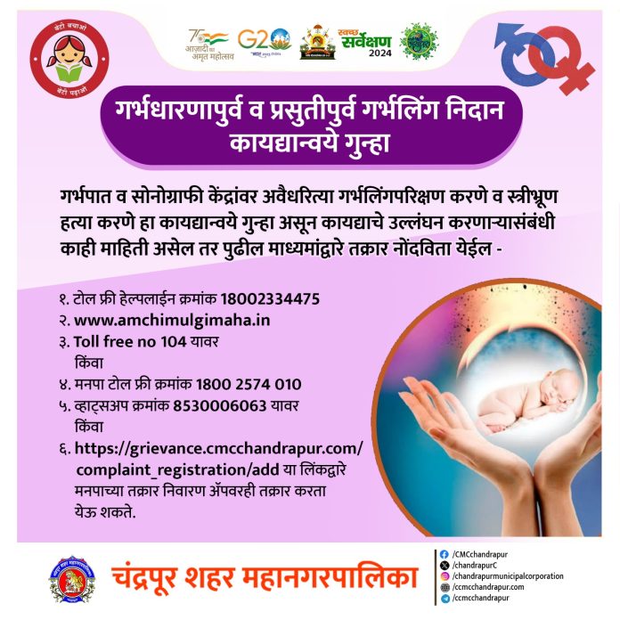 चंद्रपूर ३ जुलै – गर्भपात व सोनोग्राफी केंद्रांवर अवैधरित्या गर्भलिंगपरिक्षण करणे व स्त्रीभ्रूण हत्या करणे हा कायद्यान्वये गुन्हा असून कायद्याचे उल्लंघन करणाऱ्यांची माहिती देणाऱ्या खबरी व्यक्तीस १ लाख रुपयांचे बक्षीस शासनातर्फे व स्टिंग ऑपरेशनसाठी तयार होणाऱ्या गर्भवती महिलेस २५ हजारांचे बक्षीस चंद्रपूर मनपातर्फे देण्यात येणार आहे.