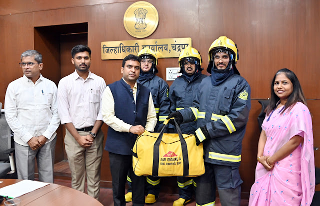चंद्रपूर, दि. 28 मार्च : राज्य आपत्ती व्यवस्थापन प्राधिकरण व जिल्हा आपत्ती व्यवस्थापन प्राधिकरण यांच्या संयुक्त विद्यमानाने चंद्रपूर जिल्ह्यातील नगर परिषद व नगर पंचायत येथे कार्यरत असलेल्या अग्निशमन दलातील जवानांना जिल्हाधिकारी तथा जिल्हा आपत्ती व्यवस्थापन प्राधिकरणचे अध्यक्ष विनय गौडा जी.सी. यांच्या हस्ते फायर प्रॉक्झिमिटी सूट ( fire proximity suit ) चे वितरण करण्यात आले.