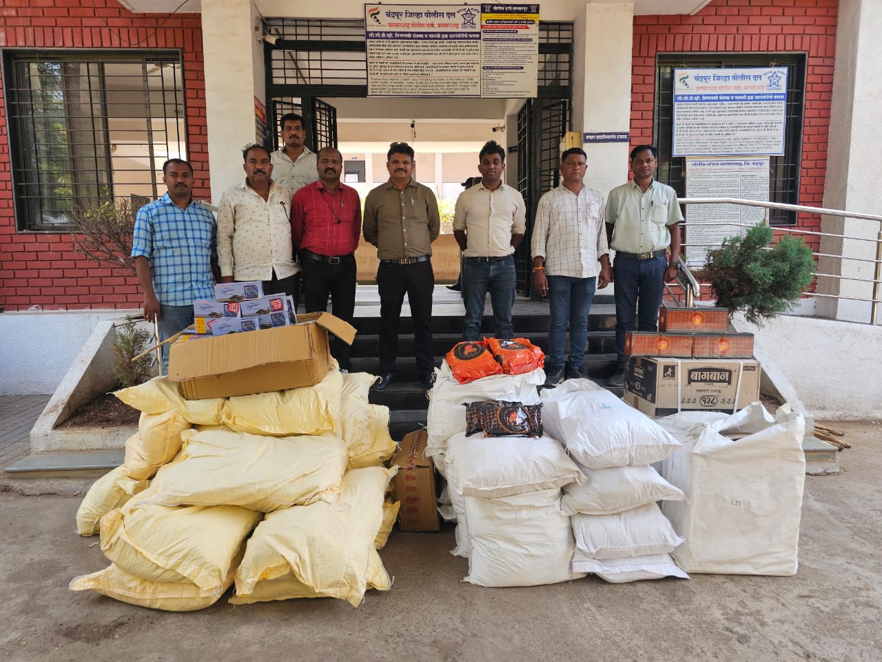 मा. पोलीस अधिक्षक मुम्मका सुर्दशन सा., चंद्रपुर यांचे आदेशान्वये चंद्रपुर जिल्हयामध्ये अवैध धंदयावर कडक कारवाई करण्याचे आदेश स्थानिक गुन्हे शाखा, चंद्रपुर यांना दिले. त्याअनुषगाने पोलीस निरीक्षक अमोल काचोरे, स्थानिक गुन्हे शाखा, चंद्रपुर यांनी वेगवेगळे पथके नेमुन त्यांना अवैध धंदयावर कारवाई करण्याचे निर्देश दिले. दिनांक ०८/०४/२०२५ गोपनिय बातमिदाराकडुन मिळालेल्या माहितीच्या आधारे आरोपी नामे हरीष ठक्कर याने मौजा मानोरा, ता. बल्लारशा, जि. चंद्रपुर येथे किरायाच्या गोडावून मध्ये मोठ्या प्रमाणात सुगंधित तंबाकु साठवून ठेवला आहे अशा खबरेवरुन मौजा मानोरा येथे जावून गोडावून ची झडती घेवून ईगल हुक्का सुगंधीत तंबाकु, होला हुक्का सुगंधीत तंबाकु तसेच मजा १०८ सुगंधीत तंबाकु असा एकुण ५,०६,९१०/-रूपयांचा माल जप्त करून नमुद आरोपी नामे हरीष अंबाराम ठक्कर, रा. विवेकानंद वार्ड, बल्लारशा, ता. बल्लारशा, जि. चंद्रपुर यांचेविरूध्द पोलीस स्टेशन बल्लारशा, जि. चंद्रपुर येथे अन्न सुरक्षा आणि मानके अधिनियम अन्वये गुन्हा नोंद करण्यात आला.