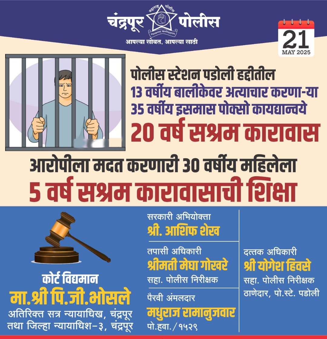पोलीस स्टेशन पडोली हद्दीत माहे जानेवारी २०२० मध्ये एका ३५ वर्षीय तरुणाने त्याच्या ३० वर्षीय महिला मित्राचे मदतीने घरासमोरील १३ वर्षीय अल्पवयीन बालीकेस आपल्या घरी बोलावुन तिचेवर अत्याचार केला होता. पिडीताचे रिपोर्टवरुन आरोपीविरुध्द पोलीस स्टेशन पडोली येथे गुन्हा नोंदविण्यात येवुन गुन्हयाचा तत्कालीन तपासी अधिकारी श्रीमती मेघा गोखरे यांनी सखोल तपास करुन आरोपीविरुध्द भक्कम पुराव्यानिशी दोषारोपपत्र न्यायालयात सादर केले असता आज दिनांक २१ मे, २०२५ रोजी कोर्ट विद्यमान मा.श्री पि.जी. भोसले, अतिरिक्त सत्र न्यायाधिश तथा जिल्हा न्यायाधिश-३ चंद्रपूर यांचे न्यायालयात आरोपी इसमास कलम ३७६ (२) (एन) भादंवि मध्ये १० वर्ष सश्रम कारावास व द्रव्य दंड, कलम ३७६ (३) भादंवि मध्ये २० वर्ष सश्रम कारावास व द्रव्य दंड, तर कलम ६ पोक्सो अॅक्ट मध्ये २० वर्ष सश्रम कारावास व द्रव्य दंडाची शिक्षा ठोठावण्यात आली तर सदर आरोपीला गुन्हा करण्यास मदत करणारी ३० वर्षीय महिलेला सुध्दा कलम ३५४ (अ) (१) (आय) भादंवि मध्ये ०३ वर्ष सश्रम कारावास व द्रव्य दंड, तसेच कलम ८ पोक्सो अॅक्ट मध्ये ०५ वर्ष सश्रम कारावास व द्रव्य दंडाची शिक्षा ठोठावण्यात आली आहे.