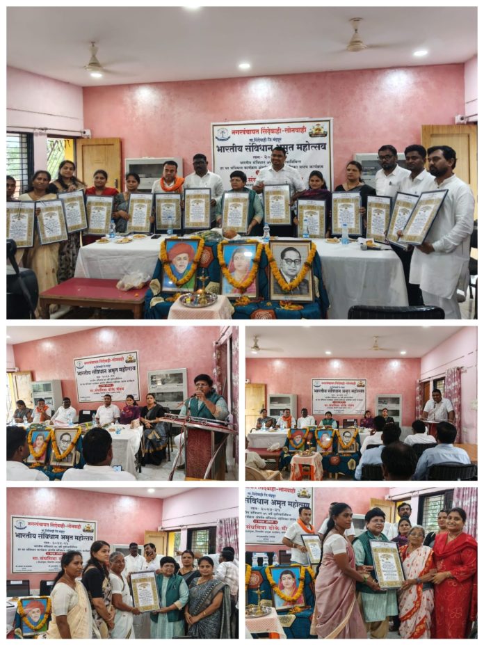 सिंदेवाही :- भारतीय संविधानास 75 वर्षे पूर्ण झाल्यानिमित्य भारतीय संविधान अमृत महोत्सव निमित्य “घर घर संविधान कार्यक्रम” सिंदेवाही-लोनवाही नगरपंचायत वतीने क्रांतीज्योती सावित्रीबाई फुले अभ्यासिका, शिक्षक कॉलणी सिंदेवाही येथे साजरा करण्यात आले.