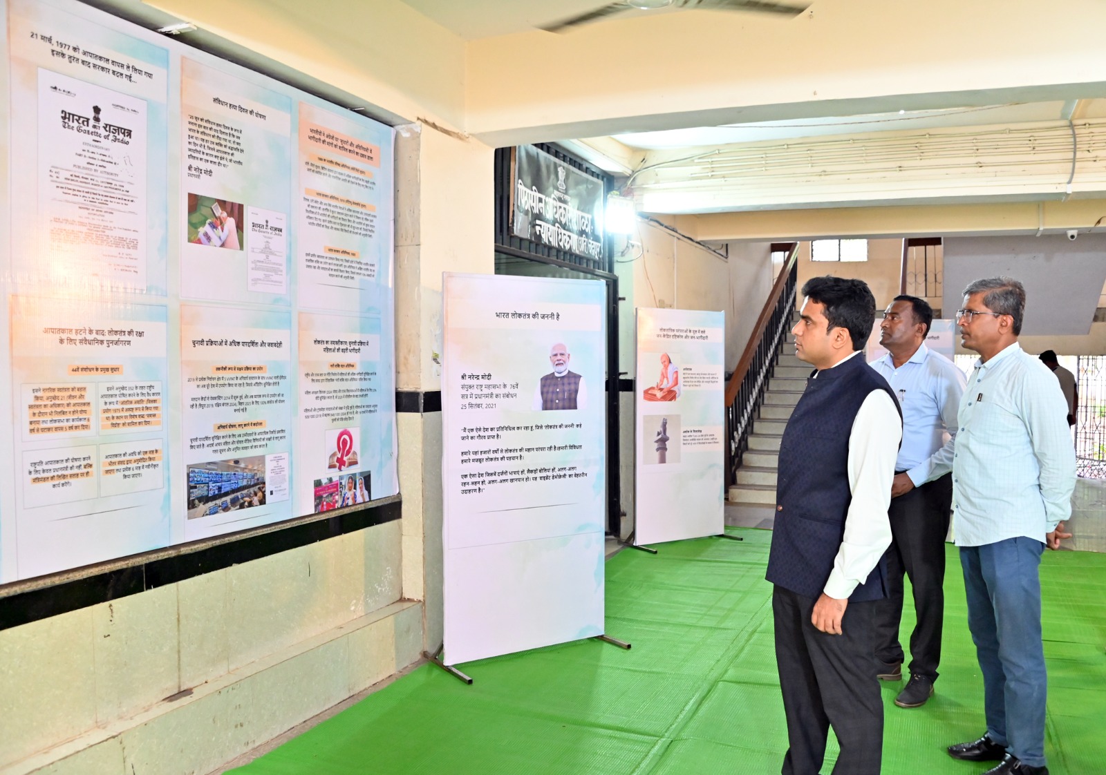 प्रदर्शनामध्ये समाविष्ट बाबी : पुरातन काळापासून भारतात सुरू असलेली लोकशाही व्यवस्था, लोकशाही परंपरेनुसार यात असलेला लोकांचा सहभाग व दृष्टीकोण, लोकशाहीचे तत्व, भारतीय परंपरा आणि सामुहिक भागीदारीने चालविण्यात आलेले शासन, ग्रामीण आणि शहरी भागातील जमीन स्तरावरील लोकशाही व्यवस्था, स्वतंत्र भारत आणि लोकशाही प्रणाली, आणीबाणीपूर्व व पश्चात भारतीय समाजव्यवस्था, आणीबाणी लावल्यानंतर प्रसिध्द झालेले राजपत्र, प्रसारमाध्यमांवरील निर्बंध, सरकारच्या विरोधात जनआंदोलन, आणीबाणी संपल्यानंतर लोकशाही मुल्यांच्या रक्षणासाठी उचलण्यात आलेली पाऊले, चंद्रपूर जिल्ह्यातील नागरिकांचा आणीबाणी विरोधातील संघर्ष लढा, आदींचा यात समावेश करण्यात आला आहे.