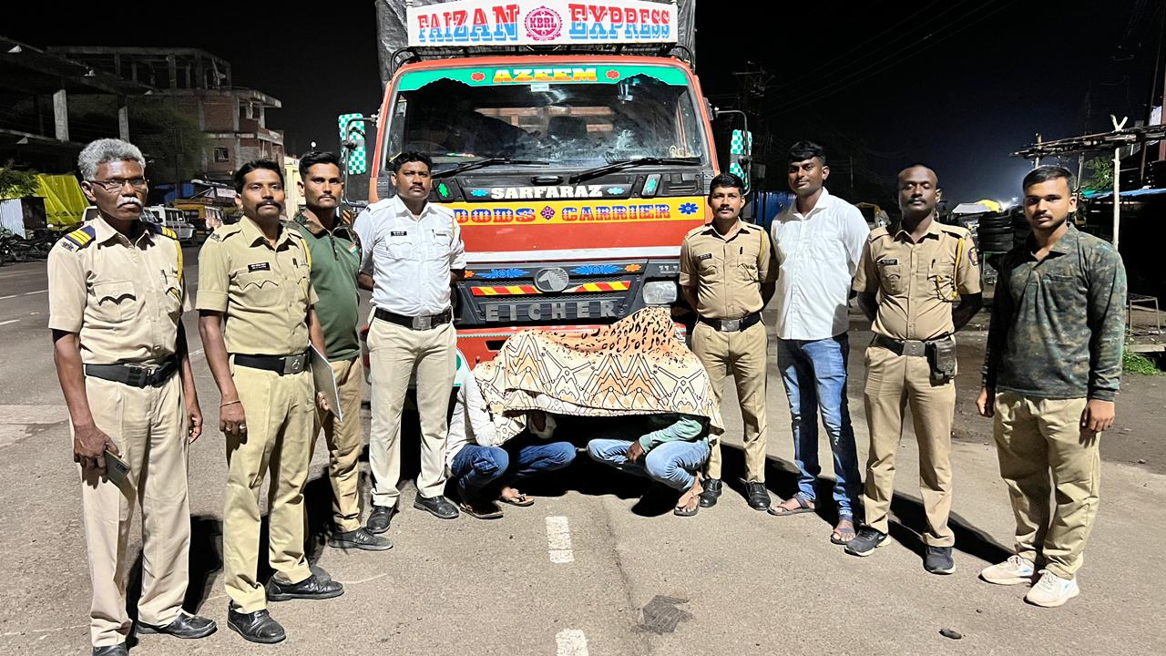 दिनांक १९ जुलै, २०२५ रोजी गोंडपिपरी पोलीसांनी शिवाजी चौक येथे केलेल्या नाकाबंदी दरम्यान अहेरी ते बल्लारपूर जाणाऱ्या रोडवरुन एका आयशर ट्रक मधुन अवैधरित्या गोवंशीय जनावरांची वाहतूक होत असल्याबाबत मिळालेल्या गोपनिय माहितीवरुन रात्रौ ०२:०० वाजता सुमारास अहेरी कडुन एक आयशर ट्रक येत असतांना दिसल्याने त्यास थांबवून पंचासमक्ष ट्रकची तपासणी केली असता त्यामध्ये २३ गोवंशीय जनावरे दोरीने बांधुन कत्तीकरीता घेऊन जात असतांना मिळुन आल्याने सदर वाहनातील आरोपी नामे (१) मो. इरफान मो. गौस वय ३७ वर्ष रा. एरकुंडा रंगारेड्डी (२) मो. शकील मो. अनवर वय २७ वर्ष रा. बंडलागुडा हैद्राबाद यांचेविरुध्द गोवंश हत्या बंदी कायद्यानुसार गुन्हा नोंद करुन त्यांच्याकडुन एक आयशर ट्रक क्र. AP22-Y-7879 किं. १३,००,०००/- रुपये, आणि २३ गोवंशीय जनावरे किं. ४,२०,०००/- असा एकुण १७,२०,०००/- रुपयाचा माल जप्त करण्यात आला आहे. पुढील तपास गोंडपिपरी पोलीस करीत आहे.