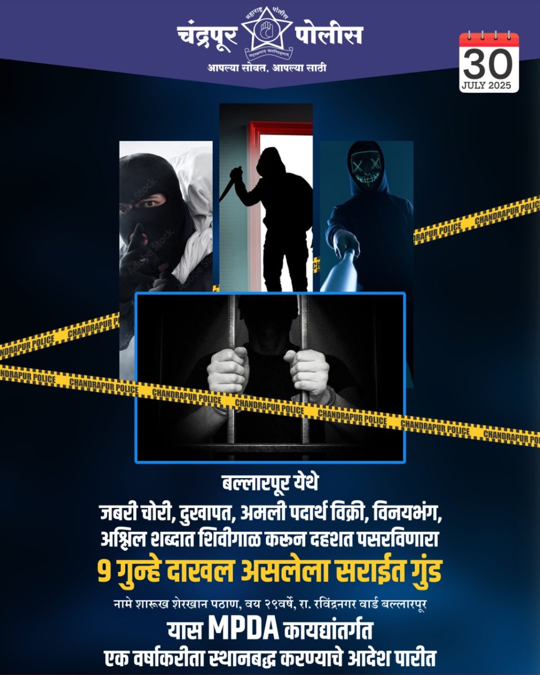 जिल्हा चंद्रपूर पोलीस अभिलेखावरील धोकादायक व्यक्ती, कुख्यात गुंड, शरीरा विरुद्धचा गुन्हेगार, आम्ली पदार्थ विक्री करणारा, जबरी चोरी, विनंयभंग, दुखापत करणारा व्यक्ती नामे शारूख शेरखान पठाण वय २९वर्षे रा. रविंद्रनगर वार्ड बल्लारपूर जि. चंद्रपूर यांचेवर पो. स्टे. बल्लारशा येथे जबरी चोरी, दुखःपत, अम्ली पदार्थ विक्री, विनयभंग, अश्लिल शब्दात शिवीगाळ, असे एकुण ०९ गुन्हे दाखल असुन त्याची परीसरामध्ये दहशत आहे. त्याने सामान्य जनते मध्ये दहशत निर्माण केली असुन त्याने गुन्हेगारी कारवाया चालुच ठेवल्याने त्याचेवर वेळोवेळी प्रतिबंधक कारवाई करून सुध्दा आरोपी कायदयाला जुमानत नसल्याने याची दखल मा. पोलीस अधीक्षक सा. चंद्रपूर यांनी घेवुन सदर इसमावर महाराष्ट्र झोपडपट्टी गुंड, हातभट्टीवाले, औषधीद्रव्य विषयक गुन्हेगार व धोकादायक व्यक्ती दृकश्राव्य कलाकृती विनापरवाना प्रदर्शन करणाऱ्या व्यक्ती (व्हिडीयो पारेट्स) वाळु तरकर अत्यावश्यक वस्तुचा काळा बाजार करणारी व्यक्ती यांच्या विघातक कृत्यांना प्रतिबंध करण्याविषयीचा अधिनियम सन १९८१ (सुधारणा २००९, २०१५) अन्वये प्रस्ताव तयार करून मा. श्री. डॉ. नितीन व्यवहारे, जिल्हादंडाधिकारी चंद्रपूर यांचेकडे सादर केला असता, त्यांनी सदर प्रस्तावाची दखल घेवुन प्रस्तावित इसम नामे शारुख शेरखान पठाण वय २९वर्षे रा. रविंद्रनगर वार्ड बल्लारपूर जि. चंद्रपूर यास नमुद कायदयांतर्गत १ वर्षा करीता स्थानबध्द करण्याबाबत दिनांक २४/०७/२०२५ रोजी आदेश पारीत केल्याने त्यास मध्यवर्ती कारागृह चंद्रपूर येथे दाखल करण्यात आले आहे.