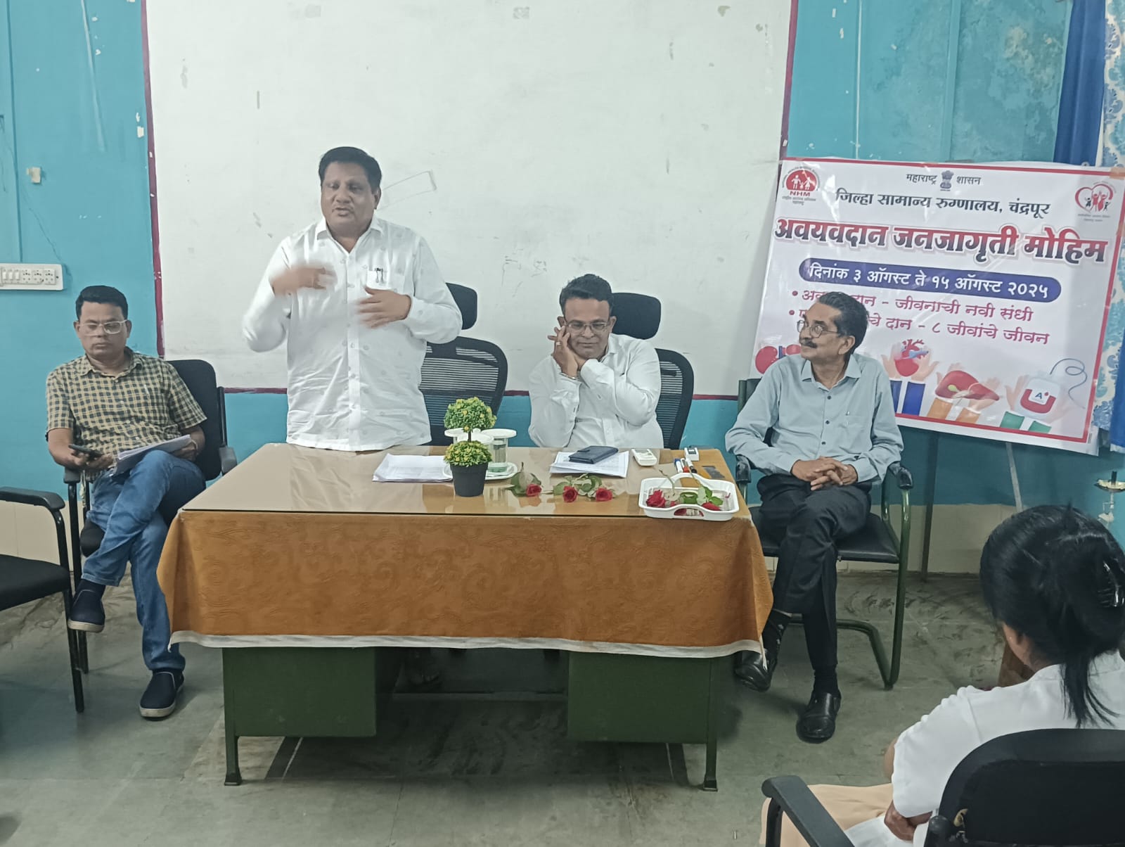 जिल्हा रुग्णालय, चंद्रपूर येथे अवयवदान दिनानिमित्त जिल्हास्तरीय उद्घाटन समारंभात ते बोलत होते. यावेळी प्रमुख अतिथी म्हणून अतिरिक्त जिल्हा शल्य चिकित्सक डॉ. भास्कर सोनारकर, तसेच वैद्यकीय अधिकारी डॉ. बंडू रामटेके, निवासी वैद्यकीय अधिकारी डॉ. हेमचंद कन्नाके, समाजसेवा अधिक्षक उमेश आडे उपस्थित होते.