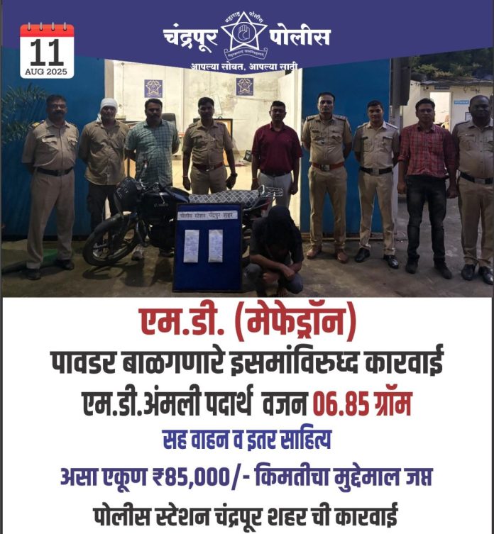 दिनांक १०/०८/२०२५ रोजी पोलीस स्टेशन चंद्रपूर शहर हद्दीत Mephedrone Drug हा अमली पदार्थ विक्री करण्याकरीता वाहतुक करीत असल्याचे गोपनिय माहितीचे आधारावरुन नेताजी चौक बाबुपेठ वार्ड चंद्रपुर येथे नाकाबंदी करुन सापळा रचुन मोटार सायकल क्रमांक एम.एच.३४ बीडब्ल्यु ८६८९ ला थांबवुन पंचासमक्ष चालकांची झडती घेतली असता चालक नामे अविनाश अनुप कुंडु वय १८ वर्ष रा. बाबुपेठ वार्ड चंद्रपूर याचे ताब्यात एकुण ०६.८५ ग्रॅम Mephedrone Drug हा अमली पदार्थ आणि वाहनासह इतर मुद्देमाल असा एकुण ८५,०००/- रुपये किंमतीचा मुद्देमाल जप्त करण्यात आला असुन आरोपीविरुध्द पोस्टे चंद्रपूर शहर येथे एन.डी.पी. एस. अॅक्ट अन्वये गुन्हा नोंदविण्यात आला आहे. गुन्हयाचा पुढील तपास चंद्रपूर शहर पोलीस करीत आहे.