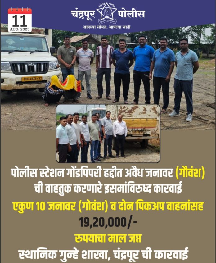 दिनांक ११ ऑगस्ट, २०२५ रोजी गोपनिय माहितीवरुन पोलीस ठाणे गोंडपिपरी हद्दीत मौजा वढोली, नांदगांव-विठठ्लवाडा जाणाऱ्या रोडवर स्थानिक गुन्हे शाखा, चंद्रपूर चे विविध पथकाने नाकाबंदी करुन दोन पिकअप वाहने थांबवुन पंचासमक्ष तपासणी केली असता सदर वाहनात एकुण १० नग जनावर (गौवंश) कोंबुन कत्तलीकरीता नेत असल्याचे दिसुन आल्याने आरोपी नामे (१) मुफीद सरवर अली वय ३१ वर्ष रा. इंदिरानगर वांकडी जि. आसीफाबाद (तेलंगना) (२) रफीक हुसेन सयद वय ३२ वर्ष रा. लक्कडकोट राजुरा, (३) समीर शमशेर खान वय २५ वर्ष (४) महमुद अली दोन्ही रा. वांकडी जि. आसीफाबाद (तेलंगना) यांच्याविरुध्द पोलीस स्टेशन गोंडपिपरी येथे कलम ११ (१), (घ), (ङ), (च), (ज) भारताचा प्राण्याणा कुरपणे वागविण्यास प्रतिबंध अधिनियम, सहकलम ५ (अ), ९, ११ महाराष्ट्र प्राणि संरक्षण अधिनियम, कलम ३२५, ३ (५), ९ भारतीय न्याय संहिता अन्वये गुन्हा नोंदविण्यात येत असुन आरोपीकडुन महिंद्रा बोलेरो पिकअप वाहन क्रमांक टी.जी. २०-टी ०४६५, आणि एम.एच. ३४ बीझेड-८४३१ आणि १० नग जनावर (गौवंश) व इतर साहित्या असा एकुण १९,२०,०००/- रुपयाचा माल जप्त करण्यात आला आहे. पुढील तपास गोंडपिपरी पोलीस करीत आहे.