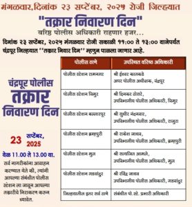 Breaking Newsक्राईम जगतचंद्रपूरमहाराष्ट्रराजकीयविदर्भसामाजिकचंद्रपूर पोलिस तक्रार निवारण दिन 23 सप्टेंबर रोजी जिल्ह्यातील सर्व पोलिस स्टेशन येथे सकाळी 11-00 ते 01-00 वाजेपर्यंत By public samachar - September 22, 2025चंद्रपूर पोलिस तक्रार निवारण दिन 23 सप्टेंबर रोजी जिल्ह्यातील सर्व पोलिस स्टेशन येथे सकाळी 11-00 ते 01-00 वाजेपर्यंत