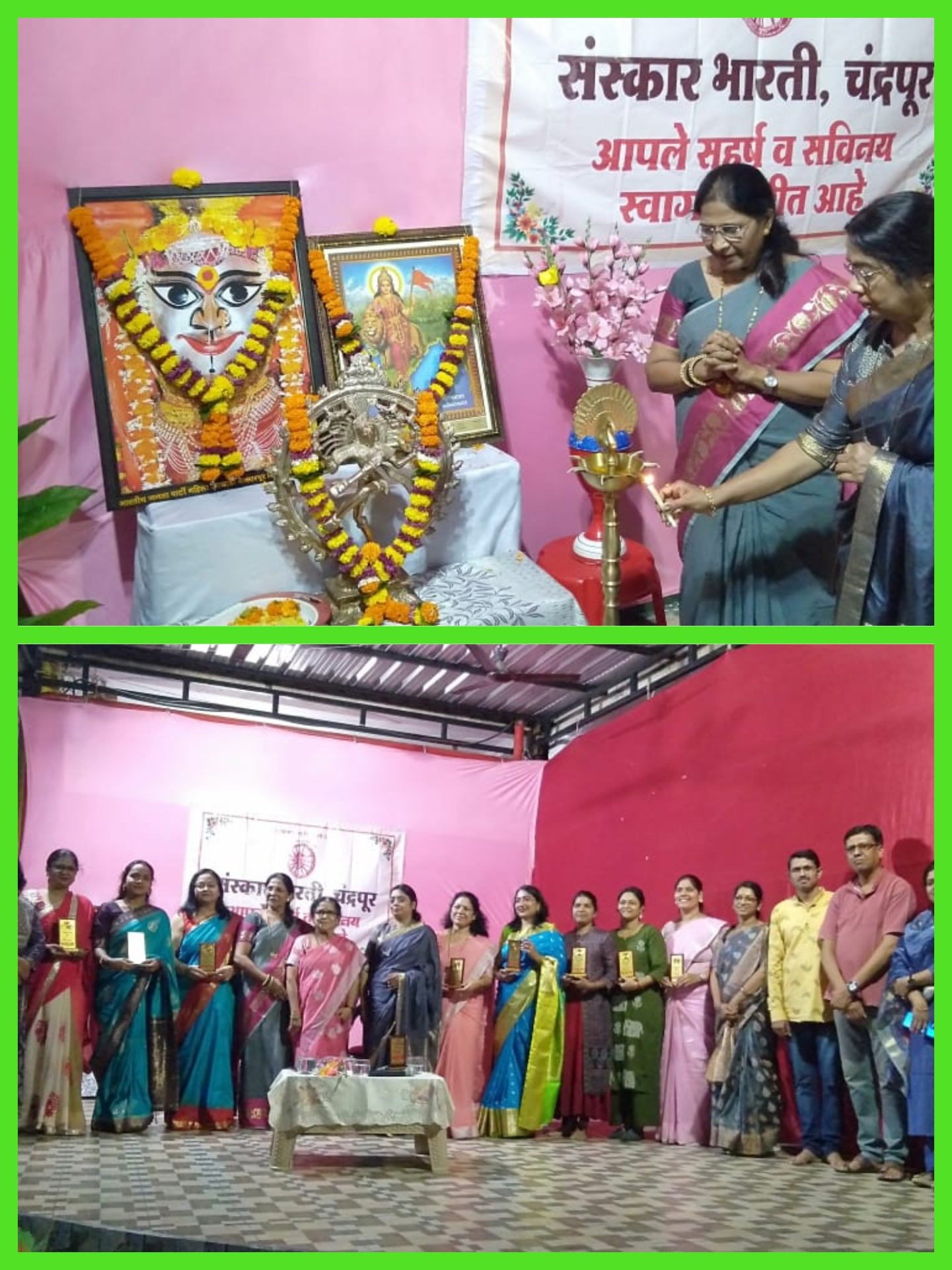 27 सप्टेंबर रोजी संस्कार भारती चंद्रपूर तर्फे नवरात्रौत्सवा निमित्त विविध क्षेत्रात लक्षणीय कामगिरी करणाऱ्या 9 कर्तृत्ववान महिलांना सन्मानित करण्यात आले. स्थानिक न्यू इंडिया कॉन्व्हेंट च्या प्रांगणात संपन्न झालेल्या या कार्यक्रमात मंचावर ज्येष्ठ पत्रकार कल्पना पलीकुंडवार, सेवानिवृत्त शिक्षिका सौ. जयश्री भात, संस्कार भारती च्या अध्यक्ष संध्या विरमलवार यांची उपस्थिती होती.