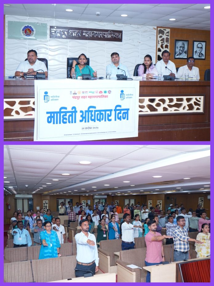 चंद्रपूर महानगरपालिकेतर्फे माहिती अधिकार दिन 29 सप्टेंबर रोजी उत्साहात साजरा करण्यात आला. महाराष्ट्र शासनातर्फे 28 सप्टेंबर हा दिवस माहिती अधिकार दिन म्हणून साजरा करण्यात येतो मात्र यादिवशी शासकीय सुट्टी असल्याने सोमवार 29 सप्टेंबर रोजी हा दिवस साजरा करण्याचे शासन निर्देश होते.
