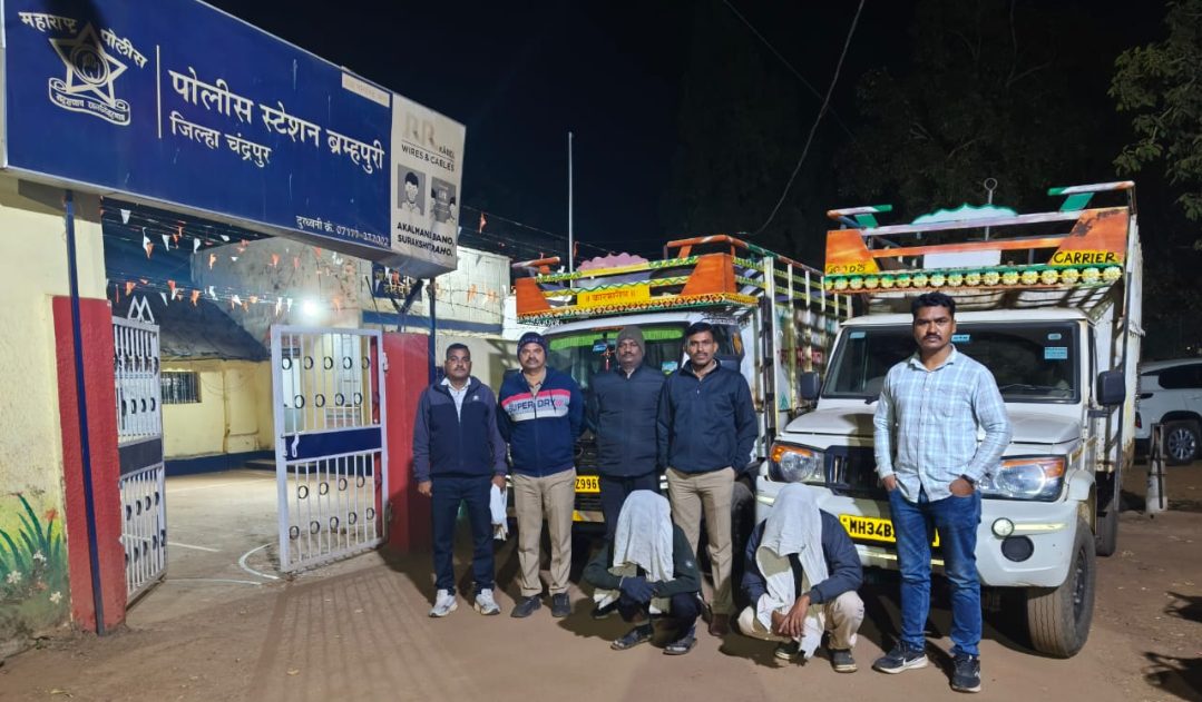 दिनांक ०८ डिसेंबर, २०२५ रोजी स्थानिक गुन्हे शाखा चंद्रपूर चे पथकाने मिळालेल्या गोपनिय माहितीचे आधारे पोलीस स्टेशन ब्रम्हपुरी हद्दीत दोन पिकअप वाहने थांबवुन पंचासमक्ष तपासणी केली असता त्यात एकुण ०६ नग गोवंशीय जनावरे (बैल) कत्तली करीता अवैधरित्या वाहतुक करुन नेत असतांना मिळुन आल्याने दोन्ही वाहनाच्या चालकांकडे विचारपुस करुन त्यांनी सांगितलेल्या ठिकाणी जावुन खात्री केली असता सदर दोन्ही ठिकाणावर एकुण १४ नग गोवंशीय जनावरे (बैल) बांधुन ठेवलेले मिळुन आले. सदर आरोपीचे ताब्यातुन एकुण २० जनावरे किं. अं.६,००,०००/- रु. आणि दोन पिकअप वाहने किं. अं. १८,००,०००/- असा एकुण २४,००,०००/- रु. चा माल मिळुन आल्याने सदर आरोपी नामे मिलींद जितेंद्र कोवे वय २० वर्ष रा. उदापुर ब्रम्हपुरी (२) अफसर अली सय्यद वय ३३ वर्ष रा. ब्रम्हपुरी आणि पाहिजे असलेला आरोपी नामे (३) पहेलवार रा. ब्रम्हपुरी याचेविरुध्द पोलीस स्टेशन ब्रम्हपुरी येथे अपराध क्रमांक ६३६/२०२५ कलम ११(१) (घ) (ड) (च) (ज) प्राण्यांना निर्दयतेने वागविण्यास प्रतिबंध अधिनियम १९६० व कलम ५ (अ), ५ (ब), ९ महाराष्ट्र प्राणी संरक्षण कायदा व सहकलम ४९ भारतीय न्याय संहिता-२०२३ अन्वये गुन्हा नोंदविण्यात आला असुन पुढील तपास ब्रम्हपुरी पोलीस करीत आहेत.